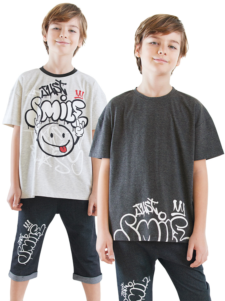 2-pack T-shirt. Black and grey melange. Short sleeves, crew neck. Graffiti print. All Denokids products are produced in accordance with European standards and "Child Safety Rules". Passed through needle detectors.