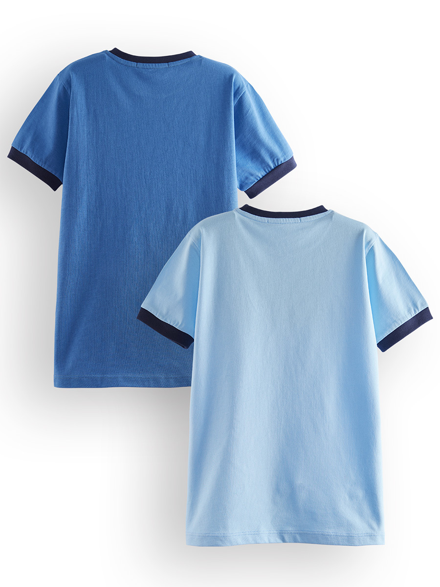 2-pack T-shirt. Cotton jersey. Navy blue and blue. Short sleeves, crew neck. Cute dinosaur print. All Denokids products are produced in accordance with European standards and "Child Safety Rules". Passed through needle detectors.