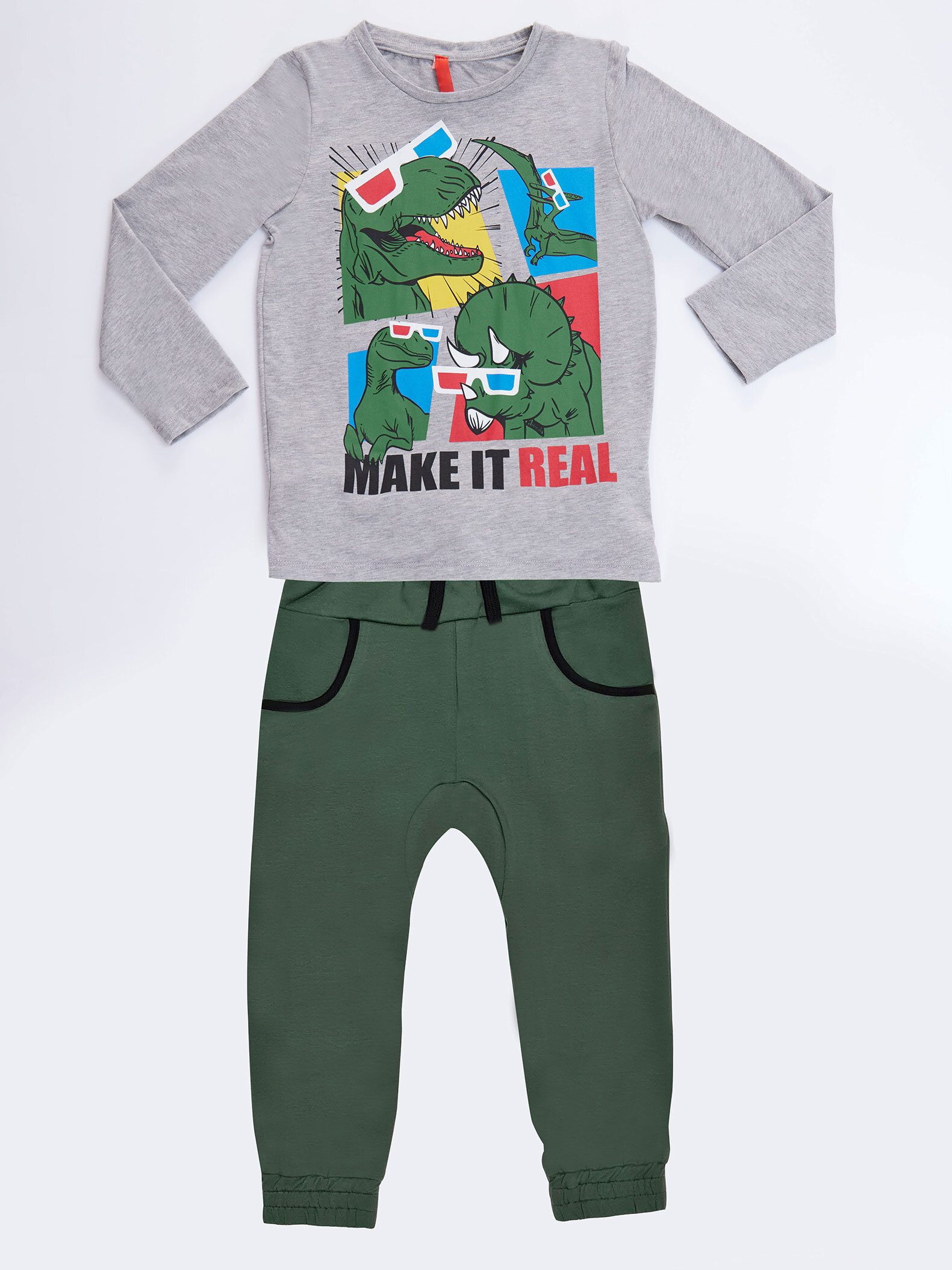 2 piece set. Dino printed, long sleeve, cotton jersey t-shirt and baggy style cotton pants, with side pockets and string on waist.