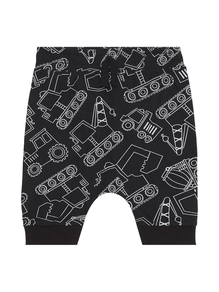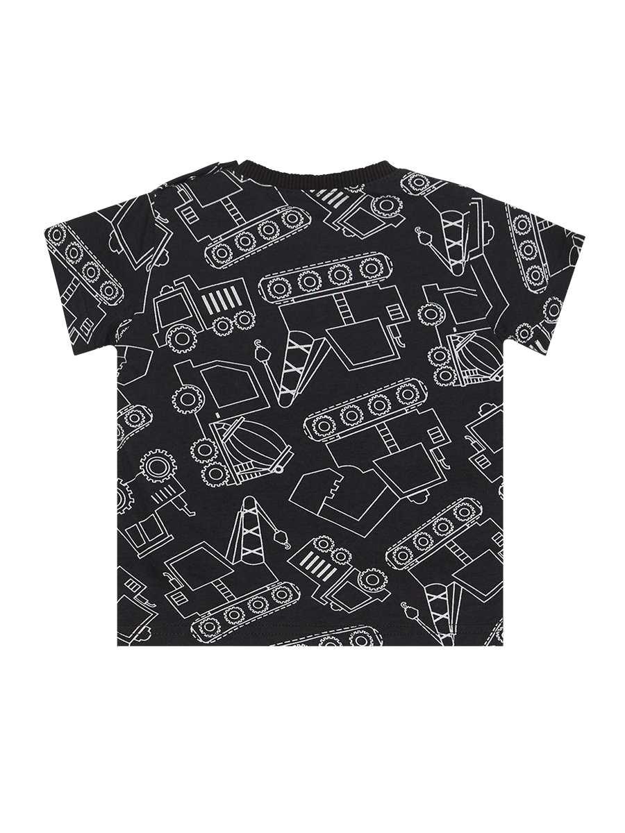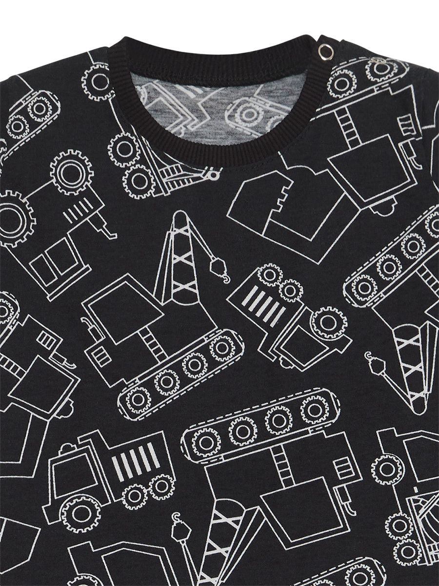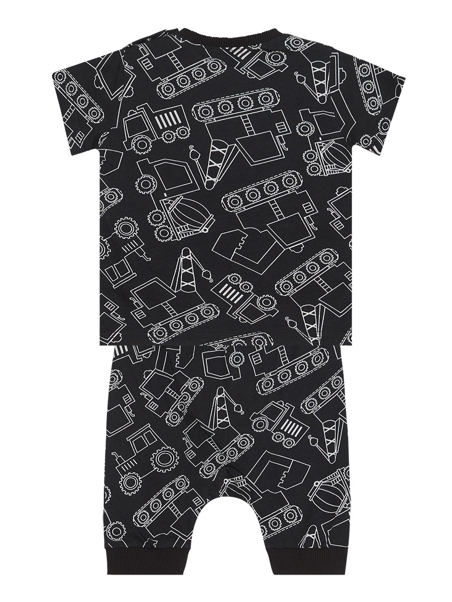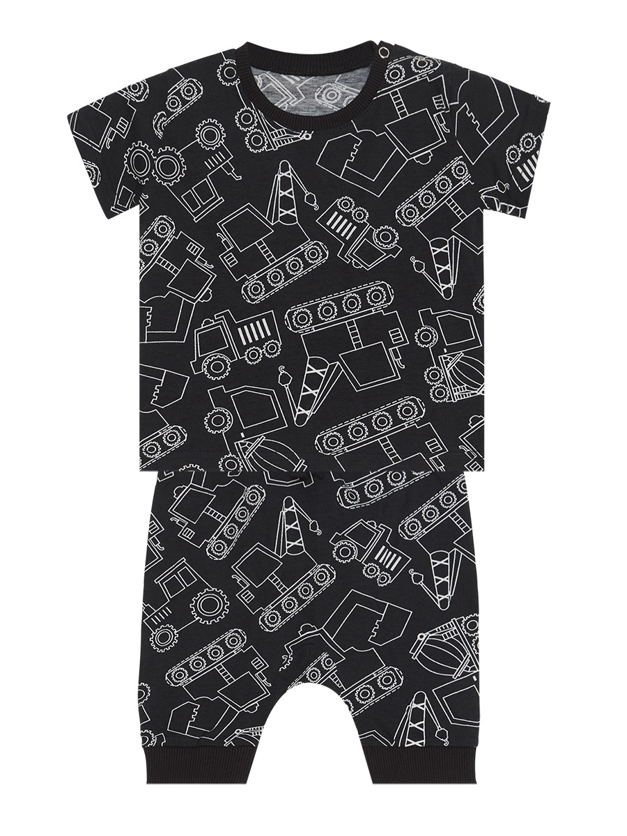 2 parça erkek bebek takım. Pamuklu penye kumaştan, siyah t-shirt. Üzeri inşaat arabaları baskılı. Düşük ağ kesimli, pamuklu kumaştan, kapri boy pantolon. Beli lastik ve kordonludur. Tüm Denokids ürünleri çocuk güvenlik kurallarına uygun olarak üretilmekte ve iğne dedektörlerinden geçmektedir.