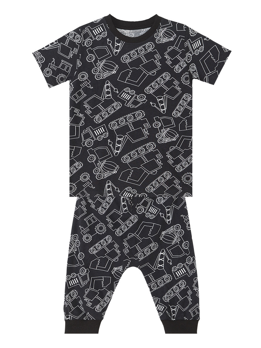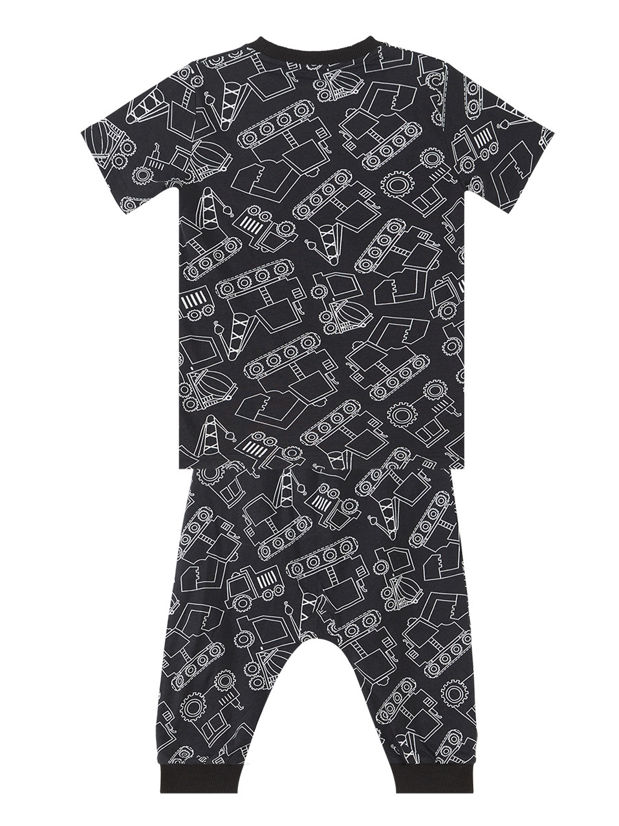 2 parça erkek takım. Pamuklu penye kumaştan, siyah t-shirt. Üzeri inşaat arabaları baskılı. Düşük ağ kesimli, pamuklu kumaştan, kapri boy pantolon. Beli lastik ve kordonludur. Tüm Denokids ürünleri çocuk güvenlik kurallarına uygun olarak üretilmekte ve iğne dedektörlerinden geçmektedir. Üst,Alt: %100 Pamuk