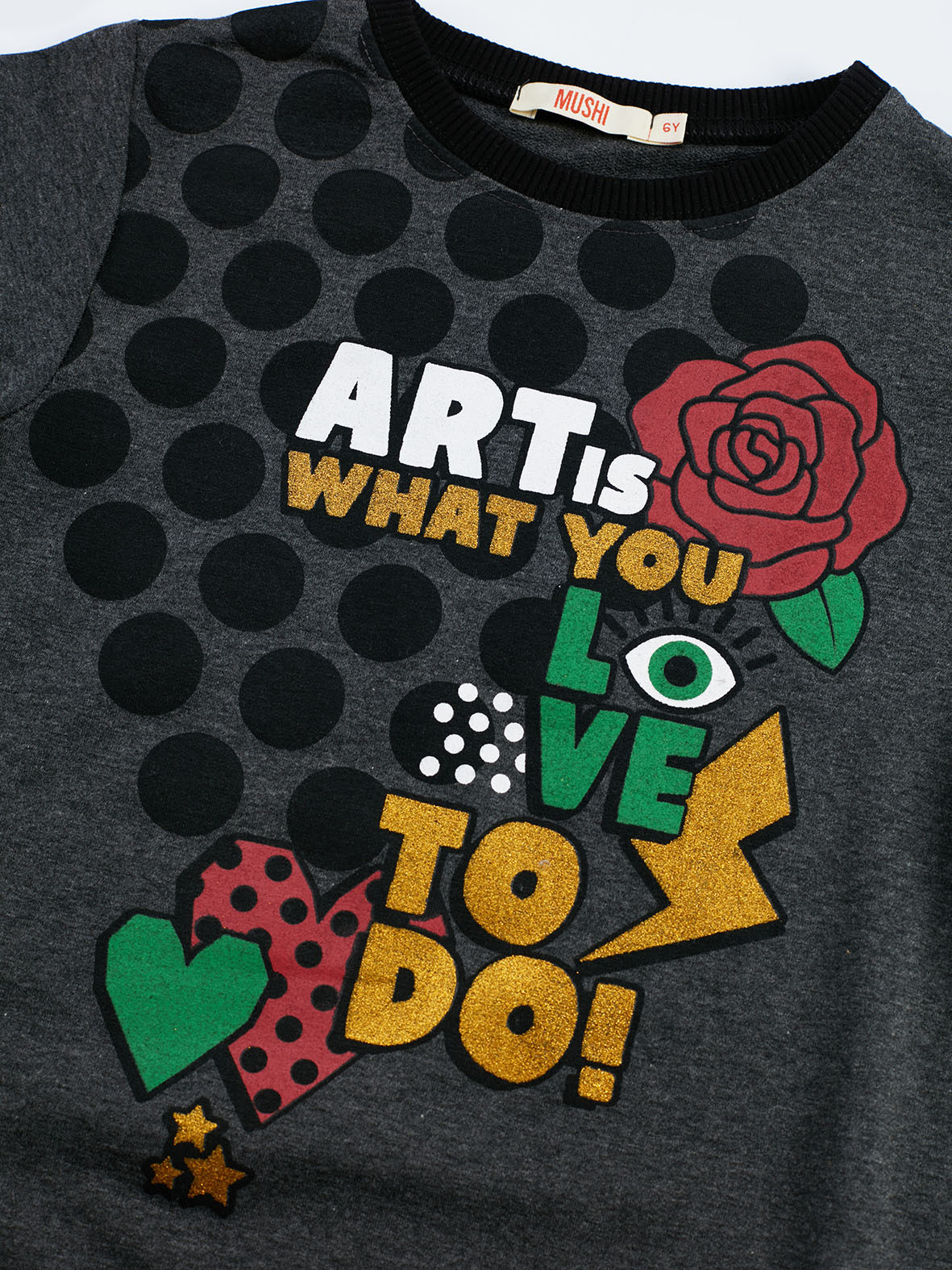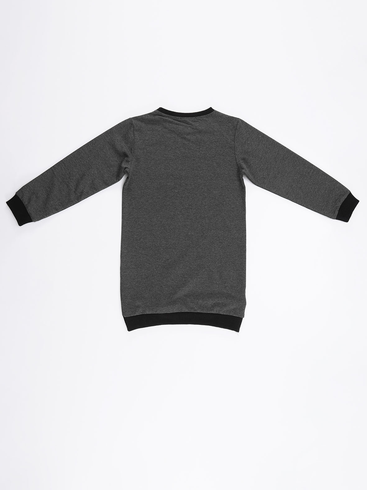 Pamuklu, orta kalın kumaştan, etekleri verev kesilmiş, sim baskılı kışlık elbise. %65 pamuk %30 polyester %5 elastan