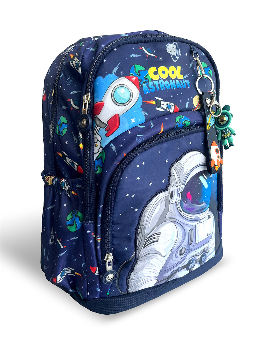 Uzay temalı bu dikkat çekici okul çanta seti, hayal gücü yüksek ve keşfetmeyi seven çocuklar için özel olarak tasarlandı. Lacivert zemin üzerine yerleştirilen astronot, roket, gezegen ve yıldız desenleriyle çocukları adeta uzayın derinliklerine doğru bir yolculuğa çıkarıyor. Setin içerisinde büyük ve kullanışlı bir sırt çantası, beslenme çantası, kalemlik ve sevimli uzay temalı anahtarlıklar yer alıyor. "Cool Astronaut" yazısıyla tasarımı tamamlanan bu set, hem dayanıklı yapısıyla hem de eğlenceli görünümüyle okul günlerini çok daha keyifli hale getiriyor.