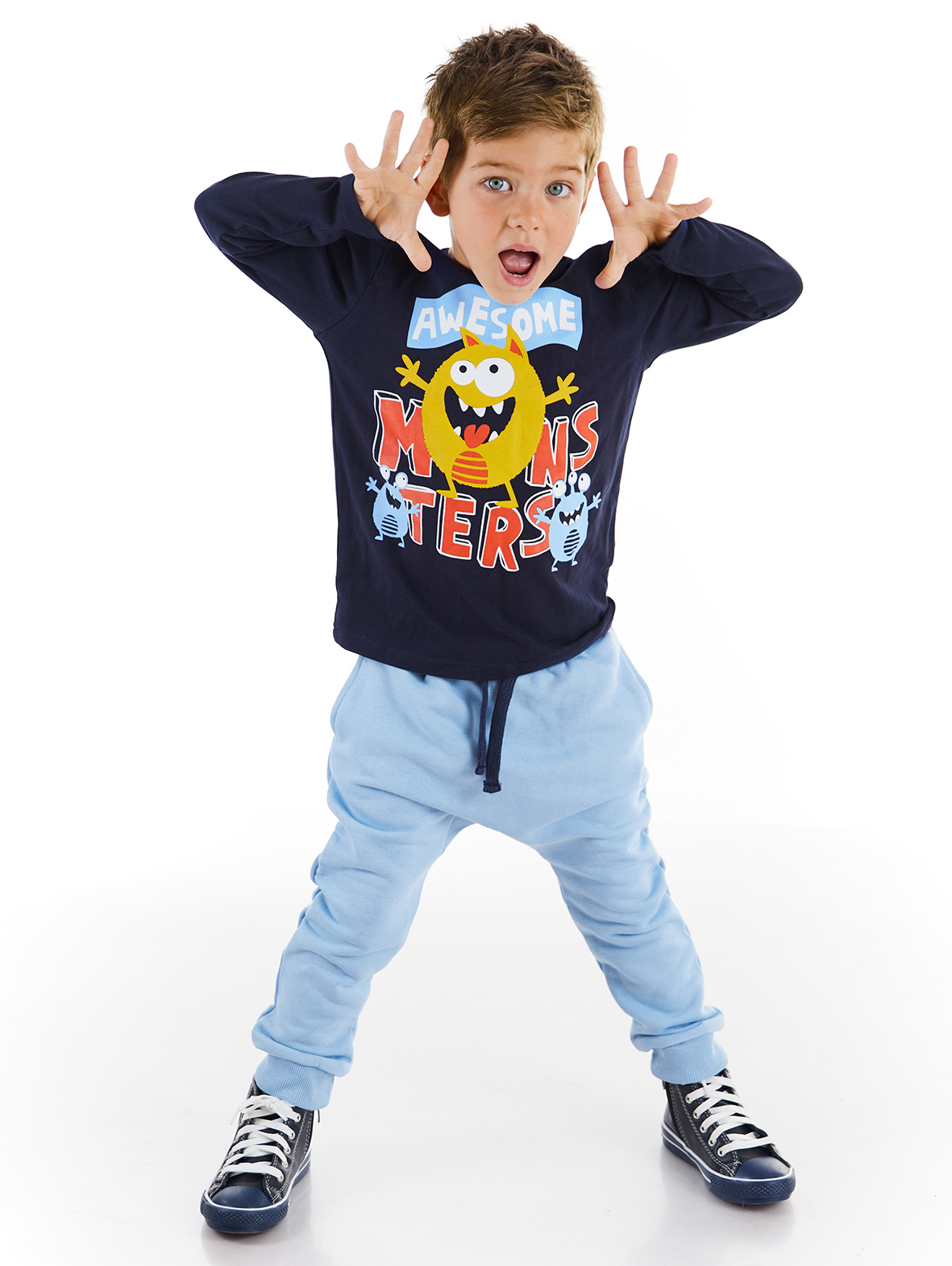 2 parça erkek çocuk pantolon ve t-shirt takım. Uzun kollu, pamuklu penye kumaştan canavar baskılı t-shirt. Ve takımın tamamlayıcısı yan cepli, beli hem lastikli, pamuklu eşofman altı. Eşofman altı düşük ağ kesimlidir.