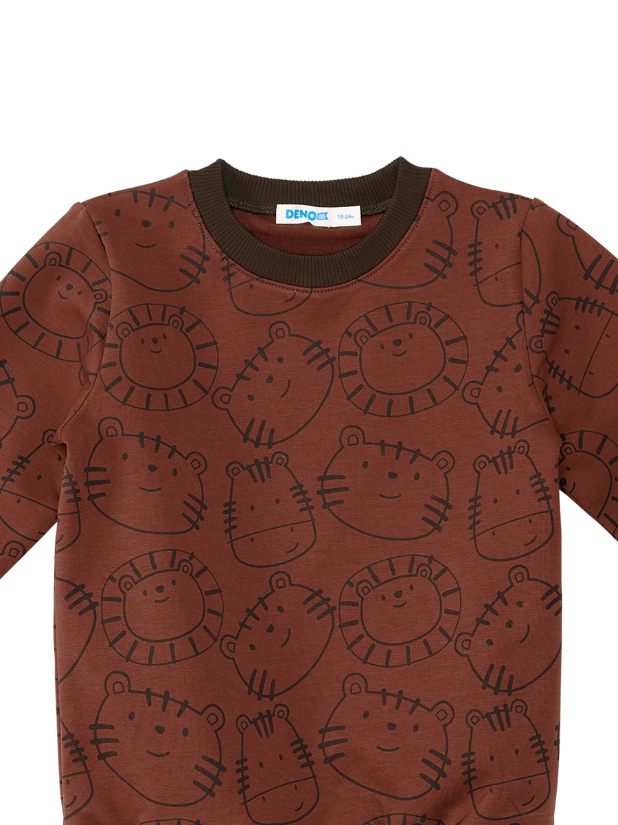 Long sleeve, thick fabric brown tracksuit. Allover, cute animal print on. Easy to wear on&off due to its snap fasteners on shoulder. Elasticated waist and ankles. All Denokids products are produced within Kids Safety Guidelines. To avoid an