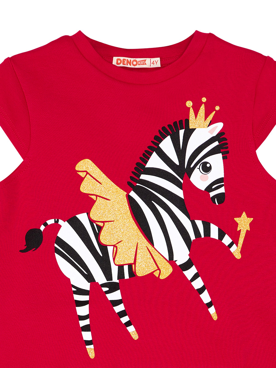 2 parça kız çocuk t-shirt ve şort takım. Pamuklu penye kumaştan, etek ucuna doğru evaze, kısa kesim, simli zebra baskılı t-shirt. Takımın tamamlayıcısı dokuma poplin kumaştan, iki katlı, zebra desenli şort. Bu ürün Avrupa standartlarında "Çocuk Güvenliği Kuralları" gözetilerek üretilmiştir. İğne dedektörlerinden geçirilmiştir. Üst, Alt: %100 Pamuk