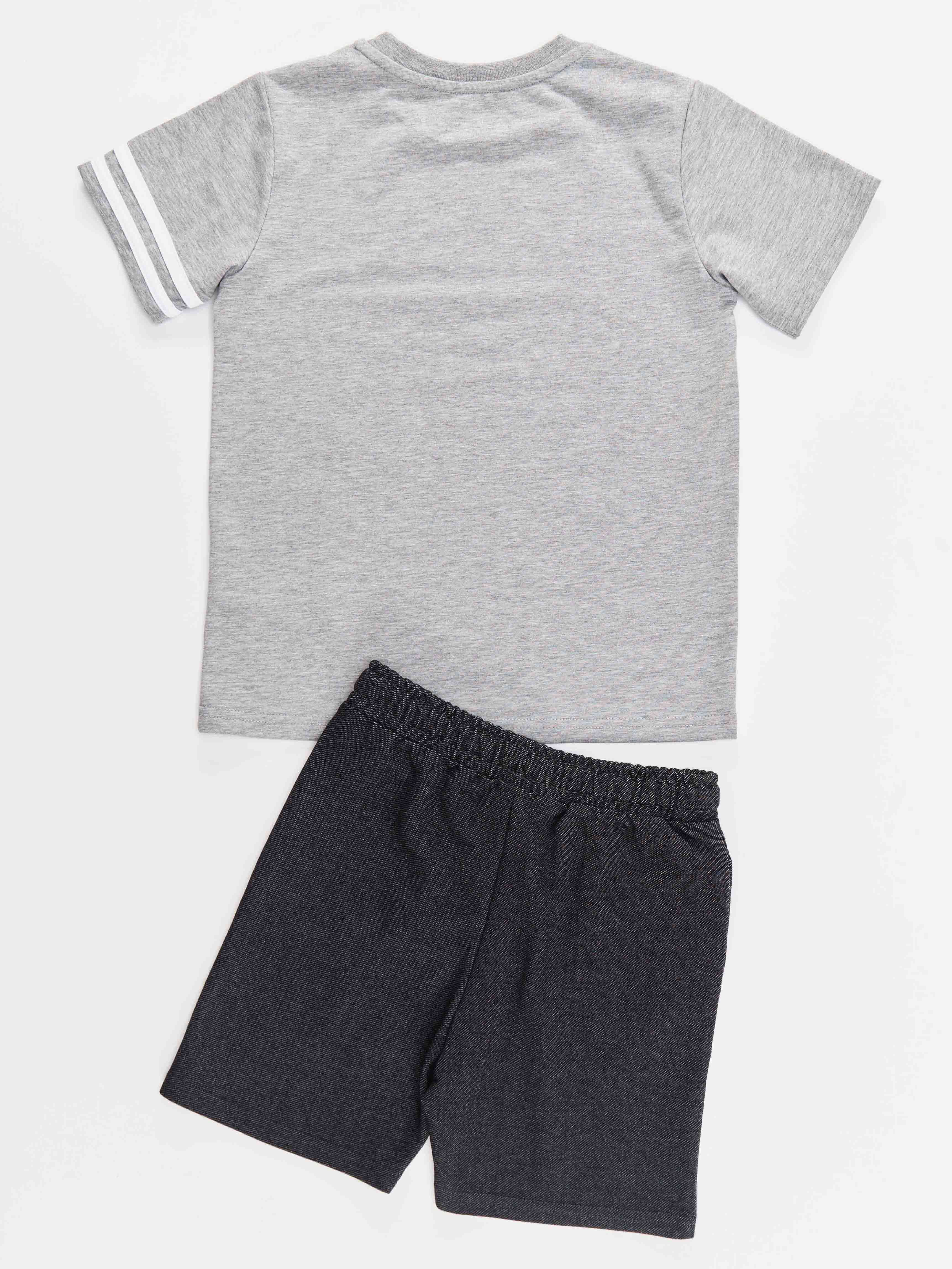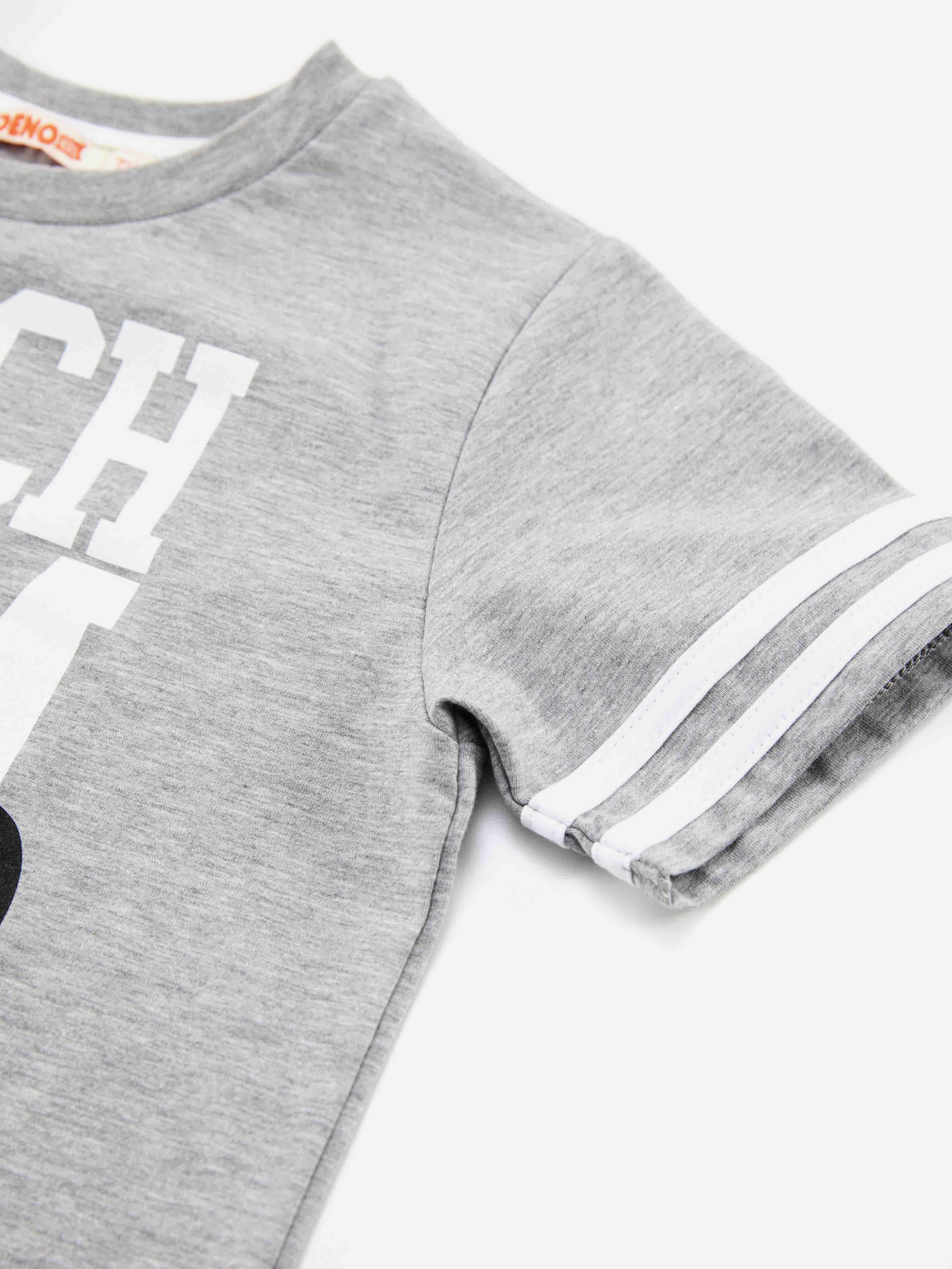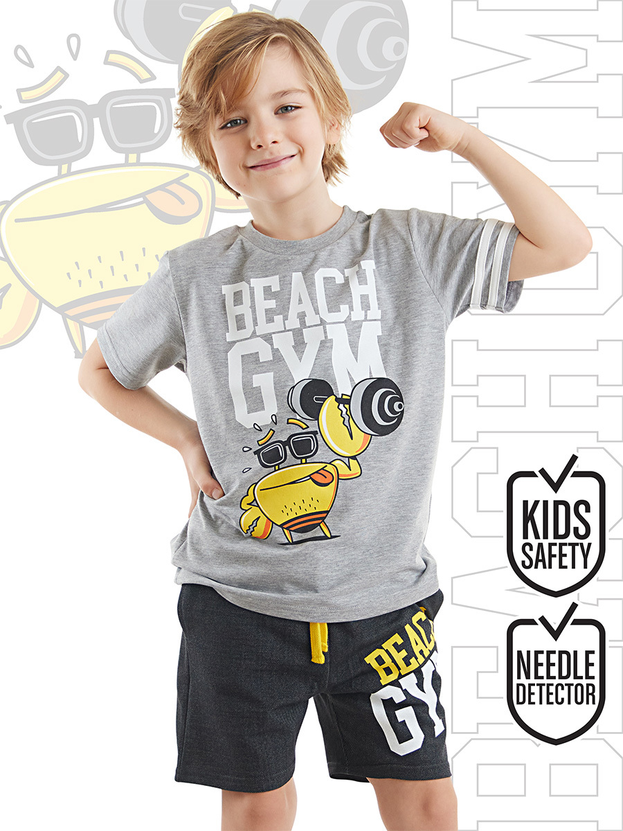 2 piece boy set. Cotton jersey t-shirt with a funny crab print on. The shorts is made of recycled fabric and has a slogan print on single side. Has 2 side pockets. Has elastic waist and strings. All Denokids Products are manufactured within