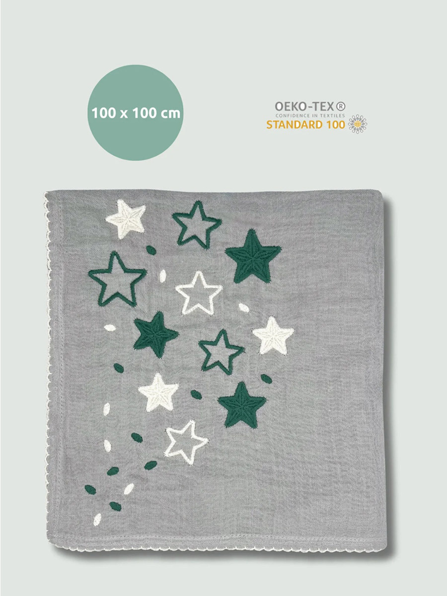 2 kat dokuma ile üretilmiş olup, 100*100 cm büyük boy ölçüsü sayesinde kundak yapmak için de uygun boyuttadır.; Pamuk iplikten yıldız nakışlıdır.; Ürünün çevresinde ayrıca kroşeta el dikişi vardır.; Bebekler için doğal içeriklerden oluşan Oeko-tex sertifikalıdır.; Müslin örtü dayanıklıdır, nefes alır, yumuşak dokusuyla bebeğinizin nazik cildine uyumludur.; Dokuma etiketi bile %100 pamuktan üretilmiştir.; Müslin battaniye yıkandıktan sonra daha da yumuşar, kendiliğinden bürümcüklenen bir dokuya sahiptir.; İstenirse ütülenerek tekrar düzleştirilebilir.100x100 cm Müslin örtü kullanım alanları:Yatakta veya pusette uyurken örtü battaniyePuset güneşlikBebek yatak çarşafı Yenidoğan zarf kundakAlt açma örtüsüOmuz örtüsüBebeğin altına sermek için misafirlikte örtüKurulama ÖrtüsüOyun halısıÇamaşır makinesinde ve elde max 40°C derecede yıkanabilir.; Düşük ısıda ütülenebilir.; Tamburlu Kurutma pamuklu ürünlerde önerilmemektedir.; %100 PamukTürkiye’de tasarlanmış ve üretilmiştir. %100 Pamuk