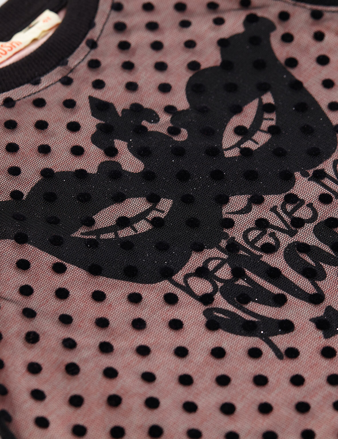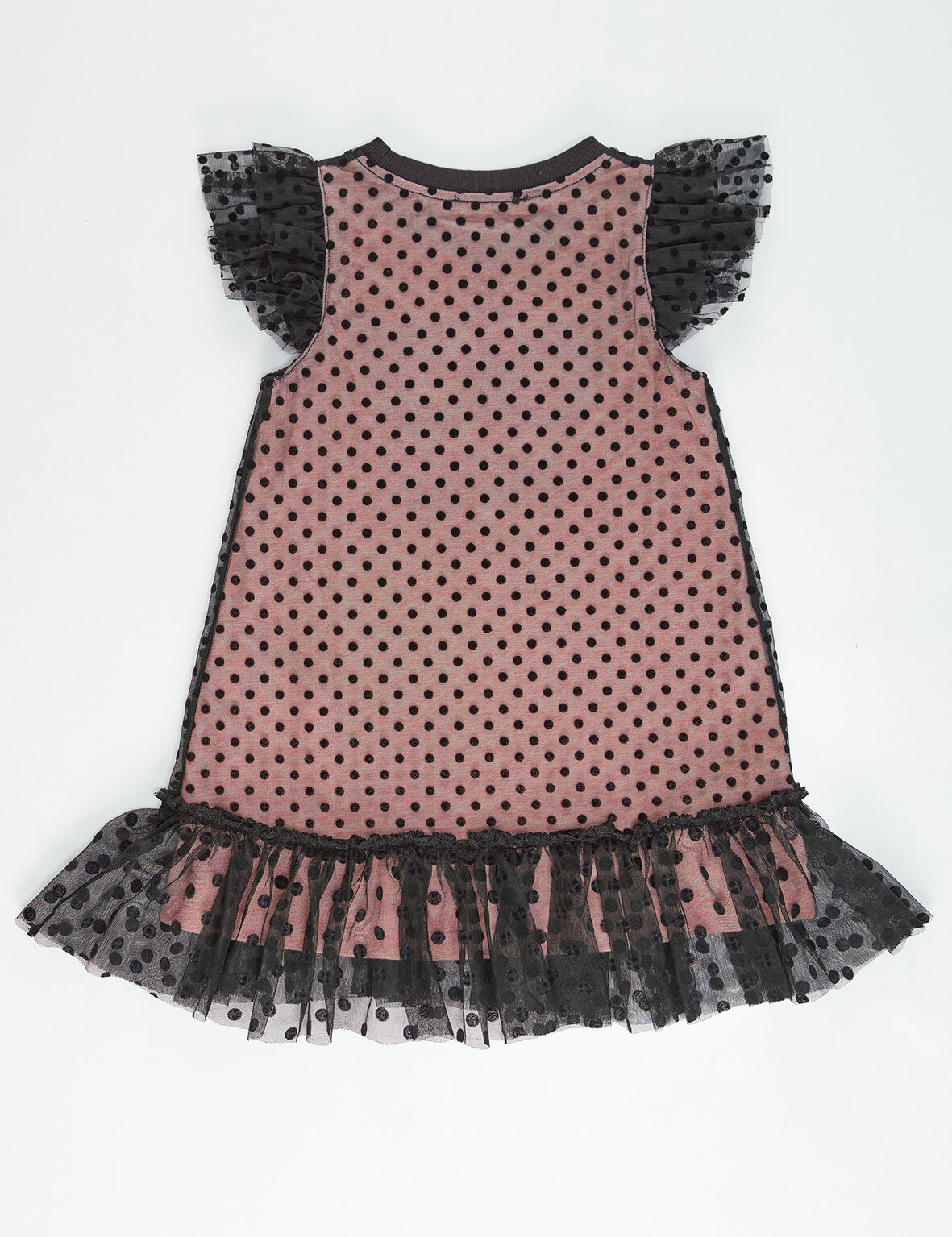 2 katlı elbise. Alt katı pamuklu kumaştan, üstü flok puantiye baskılı tülden etek ve kolları fırfırlı elbise. Tül: %100 Polyester - Astar: %95 Pamuk %5 Elastan