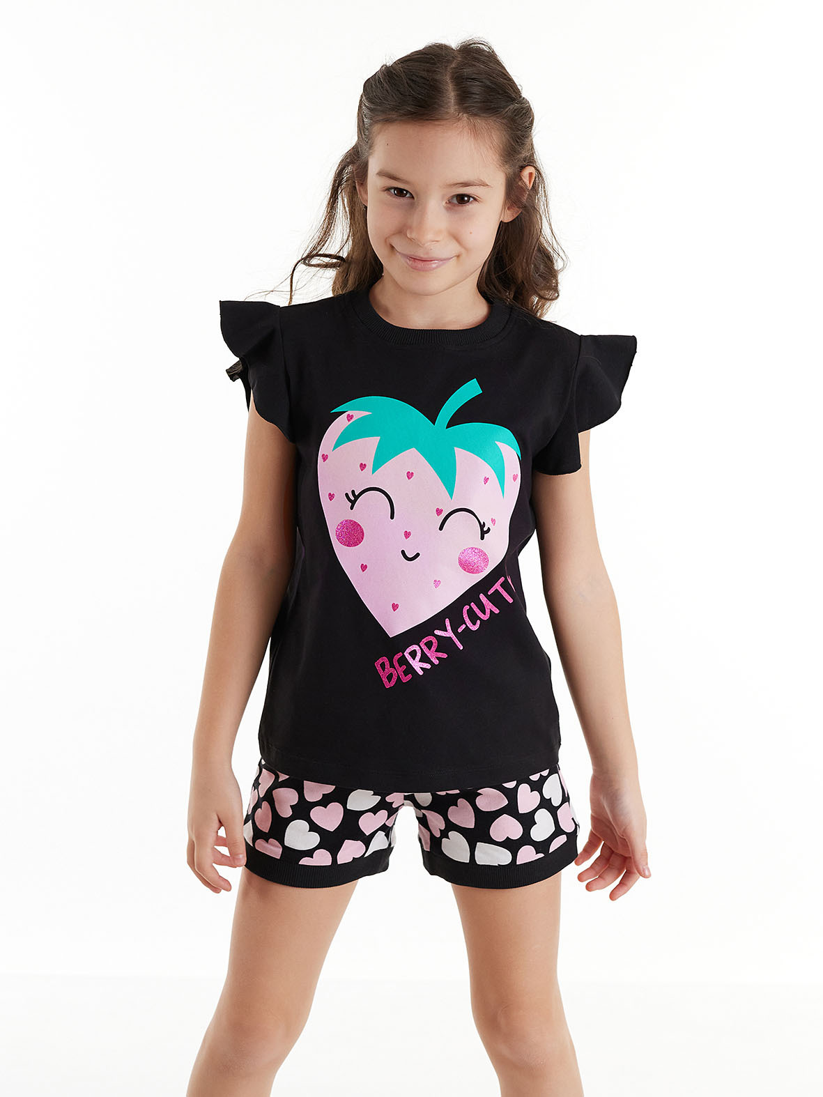 2 piece set. Cotton jersey t-shirt with a strawberry print on and ruffles on arms. The set is completed with allover hearts printed, cotton, mini shorts. Top, Bottom: 100% Cotton