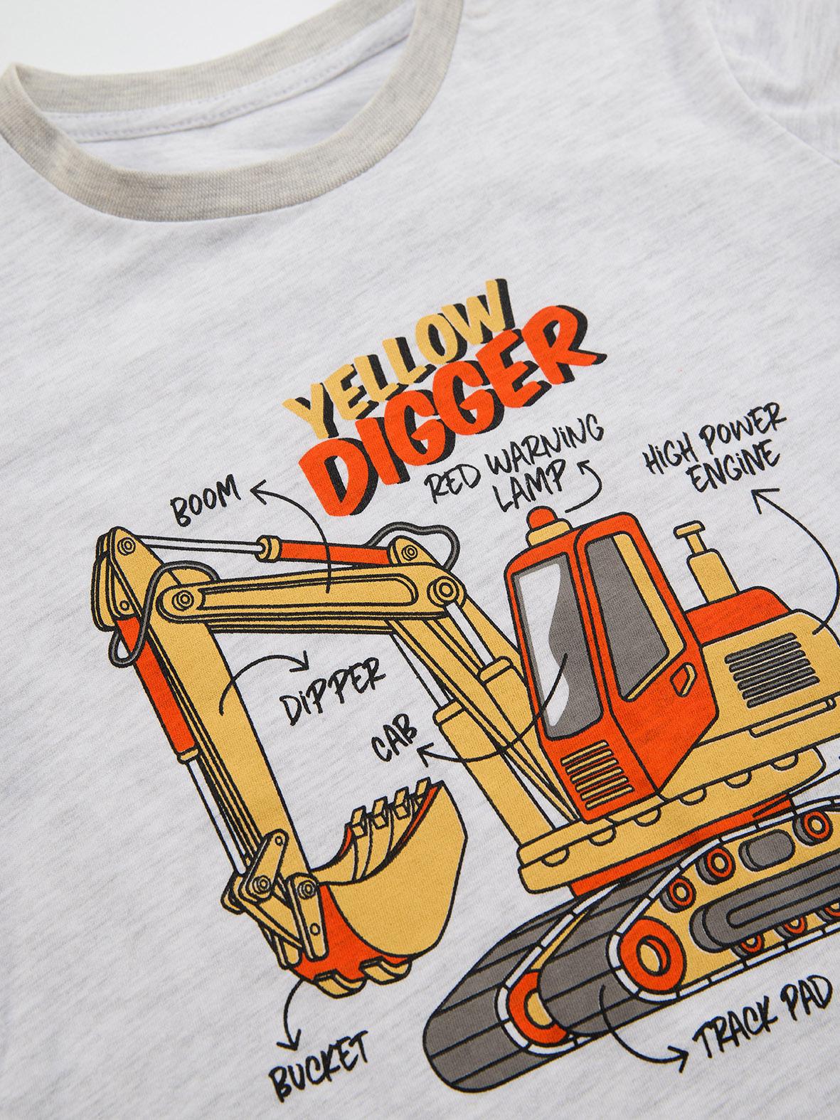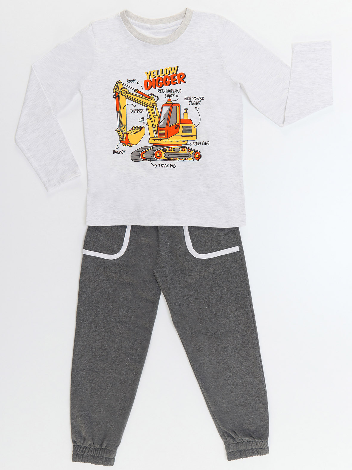 2 piece set. Digger printed, long sleeve, cotton jersey t-shirt and mid-thick cotton pants with 2 front pockets. Elastic waist. All Denokids products are produced with kids safety guidelines.