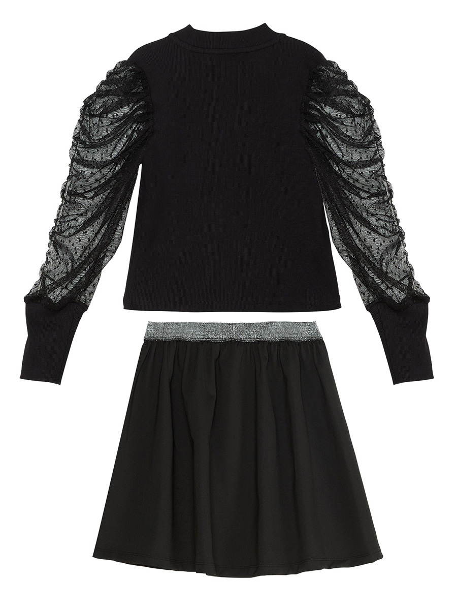 2 piece girl skirt and blouse set. The blouse has tulle arms. The skirt has silver shine elastic waist bant. All MSHB-G products are produced with-in Kids Safety Guidelines. Each&every product is deducted by metal dedectors.