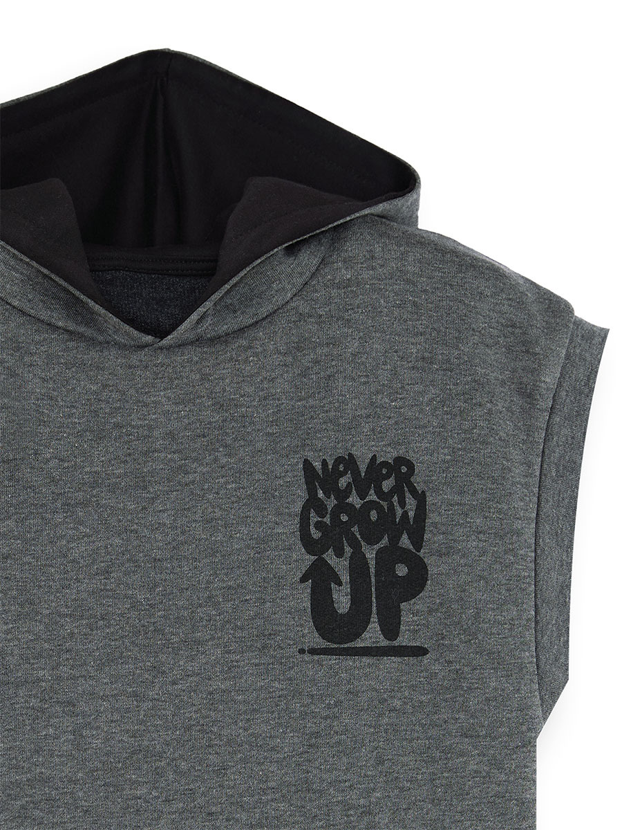 A sleeveless, hooded sweatshirt made of thick fabric. It has a large front pocket and a loose fit. It can be worn over any T-shirt or shirt. All Denokids products are produced within "Kids Safety Guidelines" and have been passed through met