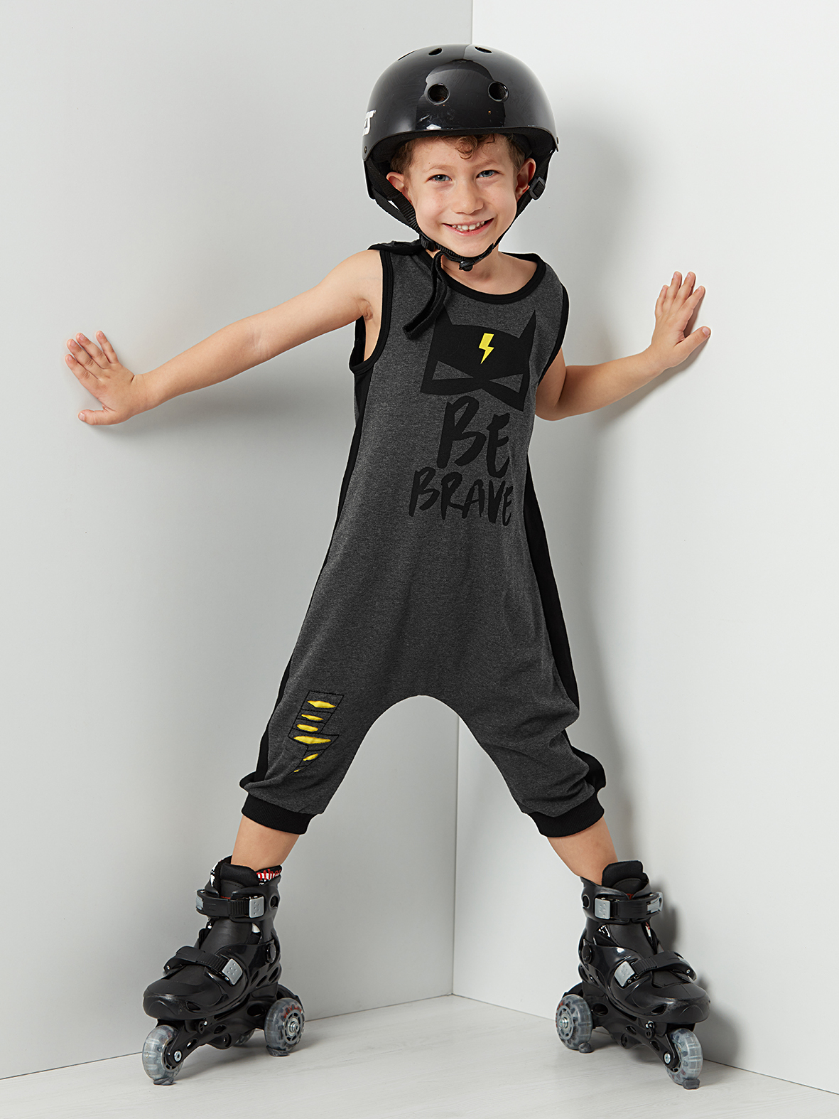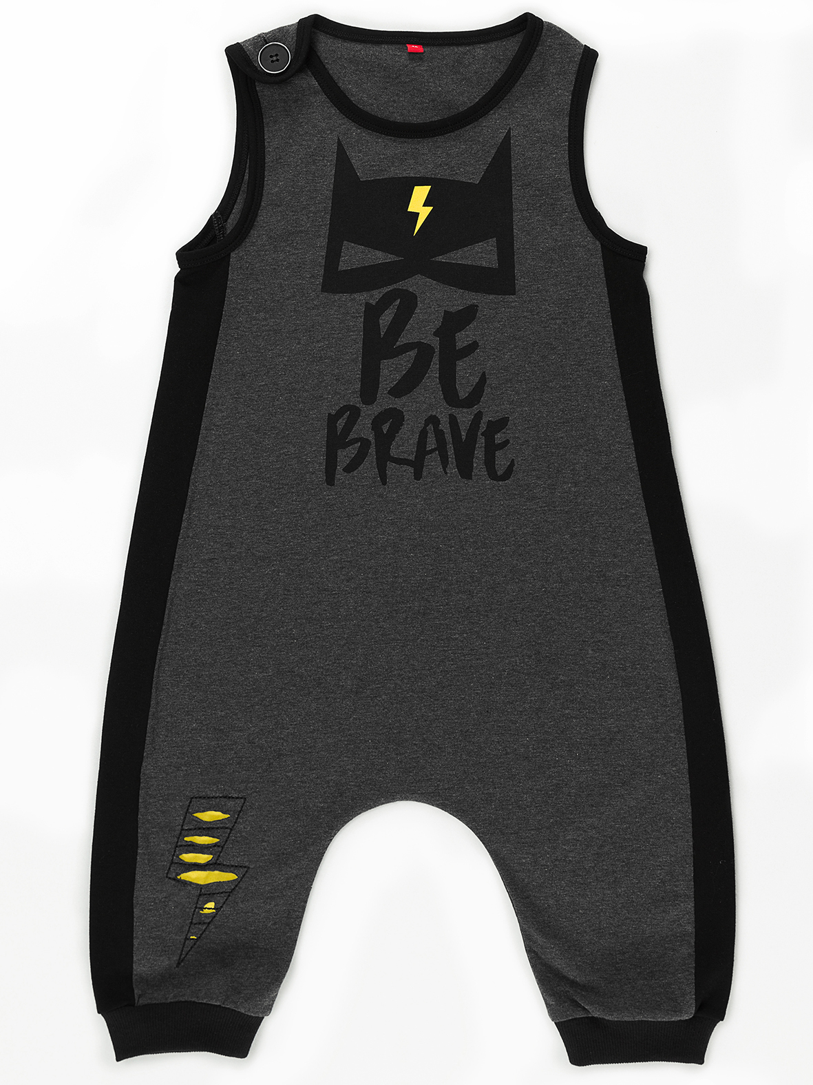 Overall with a print on and thunder applique on leg. Harem style cut. Easy to wear on&off due to its button on shoulder. %60 cotton, %40 polyester
