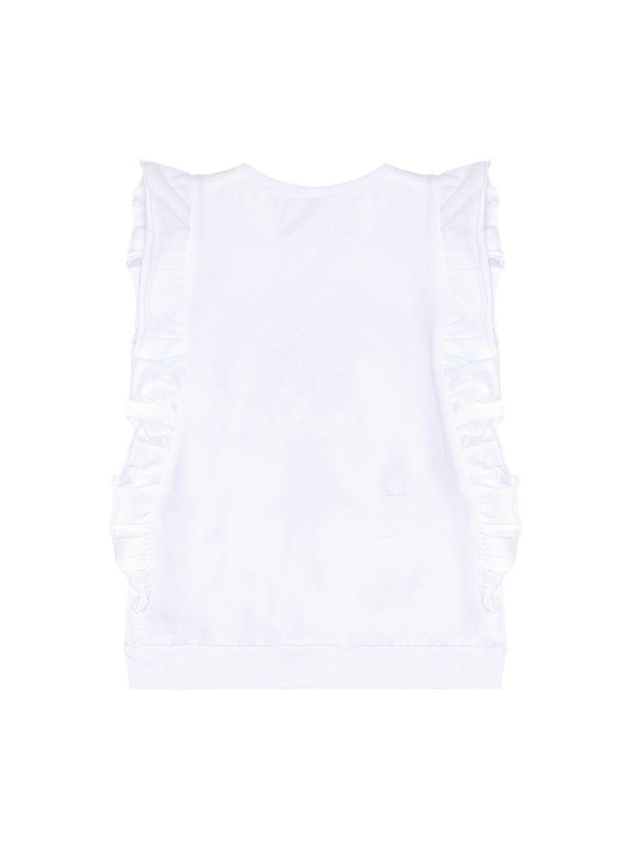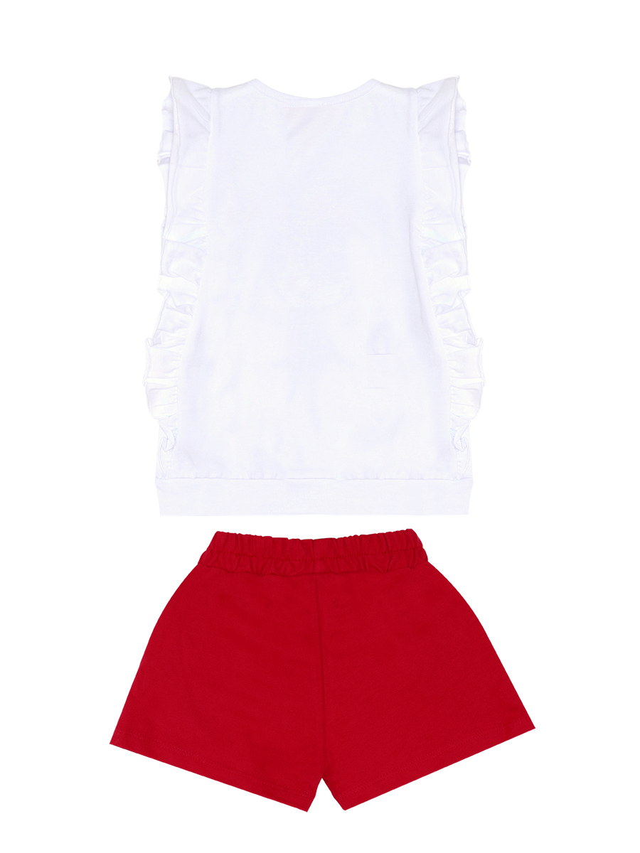 2'li takım. Sim baskılı, omuzdan bele fırfırlı t-shirt ve çiçek aplikeli şort. Üst: %95 Pamuk %5 Elastan - Alt: %96 Pamuk %4 Elastan
