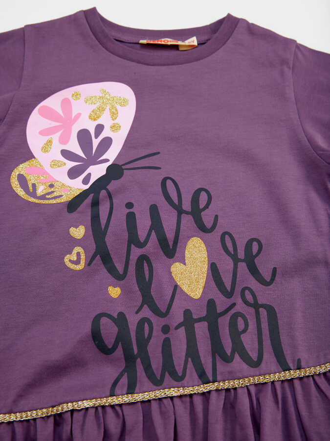 2 piece set. Tee made of cotton jersey. Has a fshiny butterfly print on. Ruffles at skirts. The set is completed with mid-thick cotton, leggings. There is a big butterfly print on both legs. Top: 100% cotton. Bottom: 92% cotton, 8% elasta