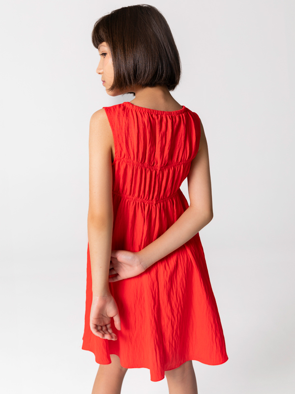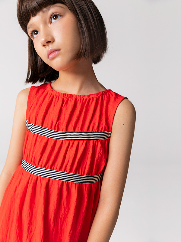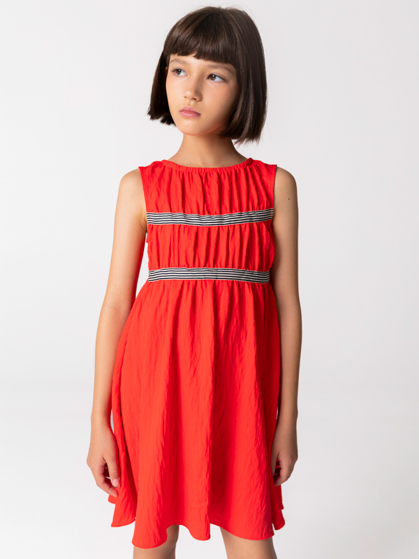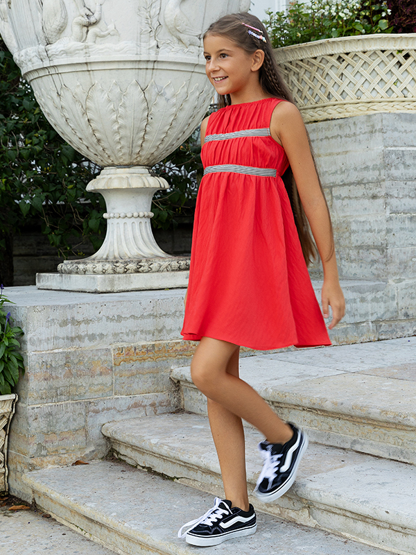 Kırmızı rengi ve göğsündeki büzgü detaylarıyla dikkat çeken bu kolsuz, sıfır yaka yaz elbisesi, siyah-beyaz şeritleriyle modern bir tarz sunuyor. Günlük kullanımda rahatlık ve şıklık arayanlar için ideal olan bu elbise, yazın vazgeçilmez bir parçası olacak.