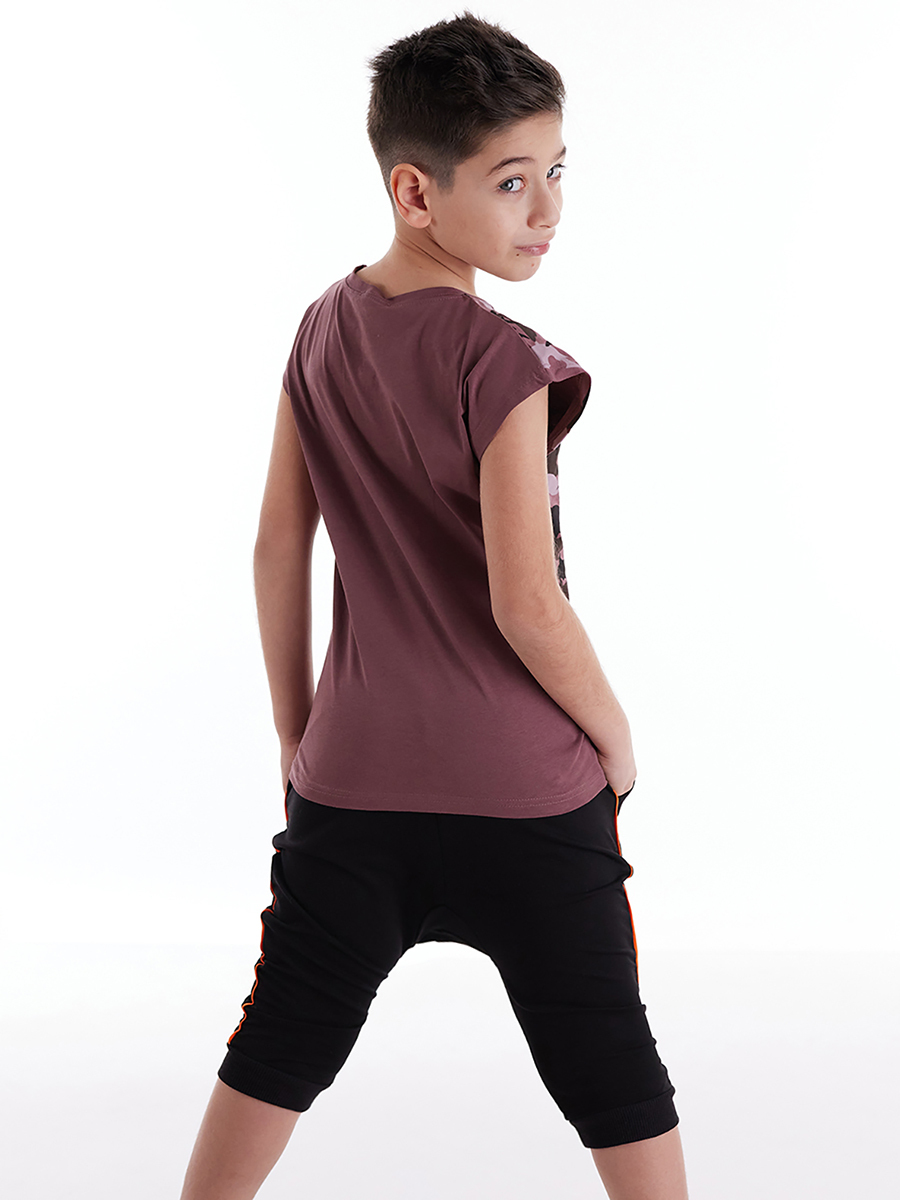 2 piece set. Allover camo printed, cotton jersey, sleeveless t-shirt with a monster print on and baggy style cotton capri pants with side pockets and side stripes.
