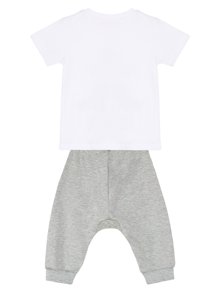 2 parça takım. Baskılı t-shirt ve gri melanj, düşük ağ kesimli, vazgeçilmez bir rahatlıkta, ön yüzü cepli baggy tarz kapri boy pantolon. Üst: %100 Pamuk - Alt: %65 Pamuk %30 Polyester %5 Elastan