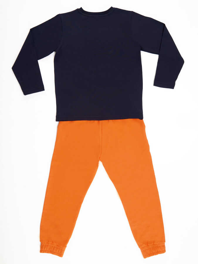 2 parça erkek çocuk sweat-pantolon ve t-shirt takım. Pamuklu penye kumaştan, uzun kollu, üzeri canavar baskılı t-shirt. Ve takımın tamamlayıcısı, orta kalın pamuklu kumaştan sweat-pantolon. Pantolon 2 ceplidir. Pantolonun beli lastikli ve kordonludur. Üst: %92 pamuk, %8 elastan. Alt: %92 pamuk, %8 elastan.