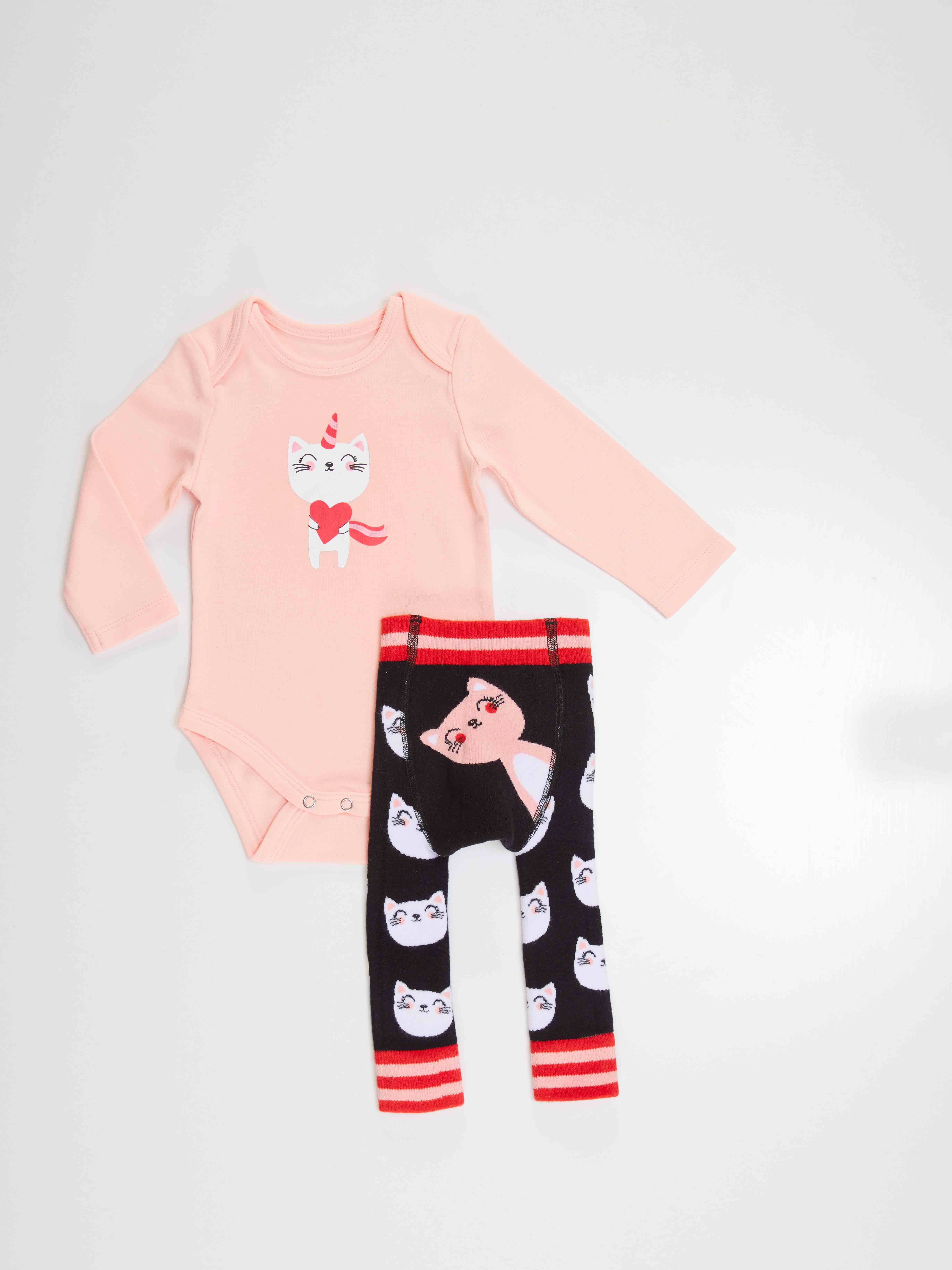 2 piece baby set. 100% Cotton bodysuit with a cat print on. The set is completed with Cotton-rich baby tight leggings. There is a cute cat face at the back of the leggings. %78 cotton %20 Poliamid %2 elastane