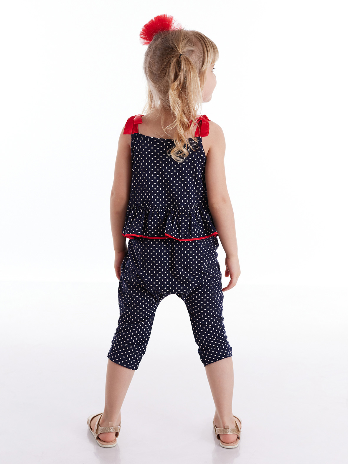 Baggy style, cotton overall with a shiny cat applique and ruffles on waist. Du to its sateen hangers, easy to wear on&off. 95% Cotton 5% Elastane