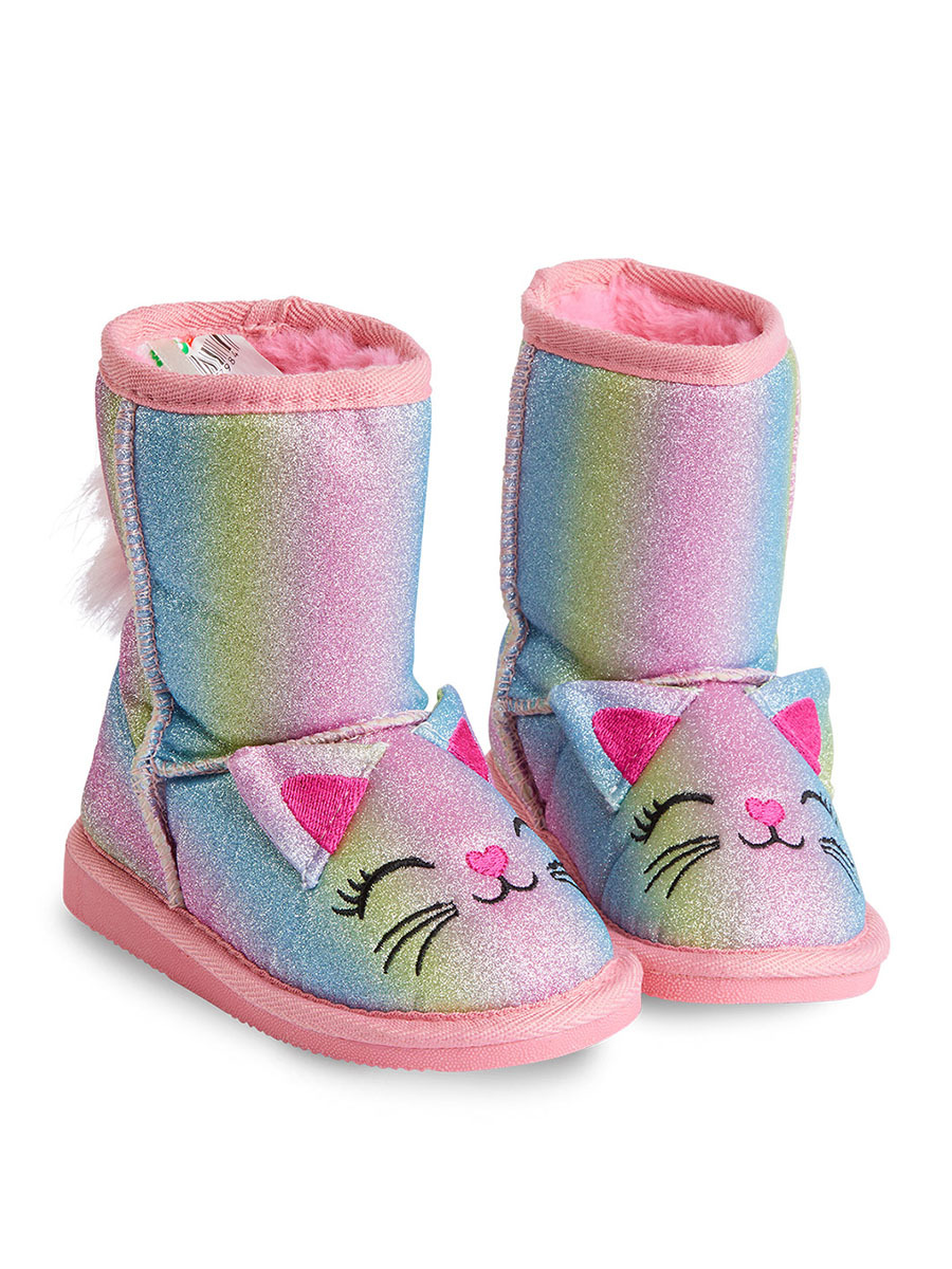 Glitter boots with a cat on. The inner of the boots is all covered with fur to keep the little feet warm. The ears of the cat is 3D. There is a plush on the back of the boots. Since it has no waterproof feature, better to wear on dry weathe