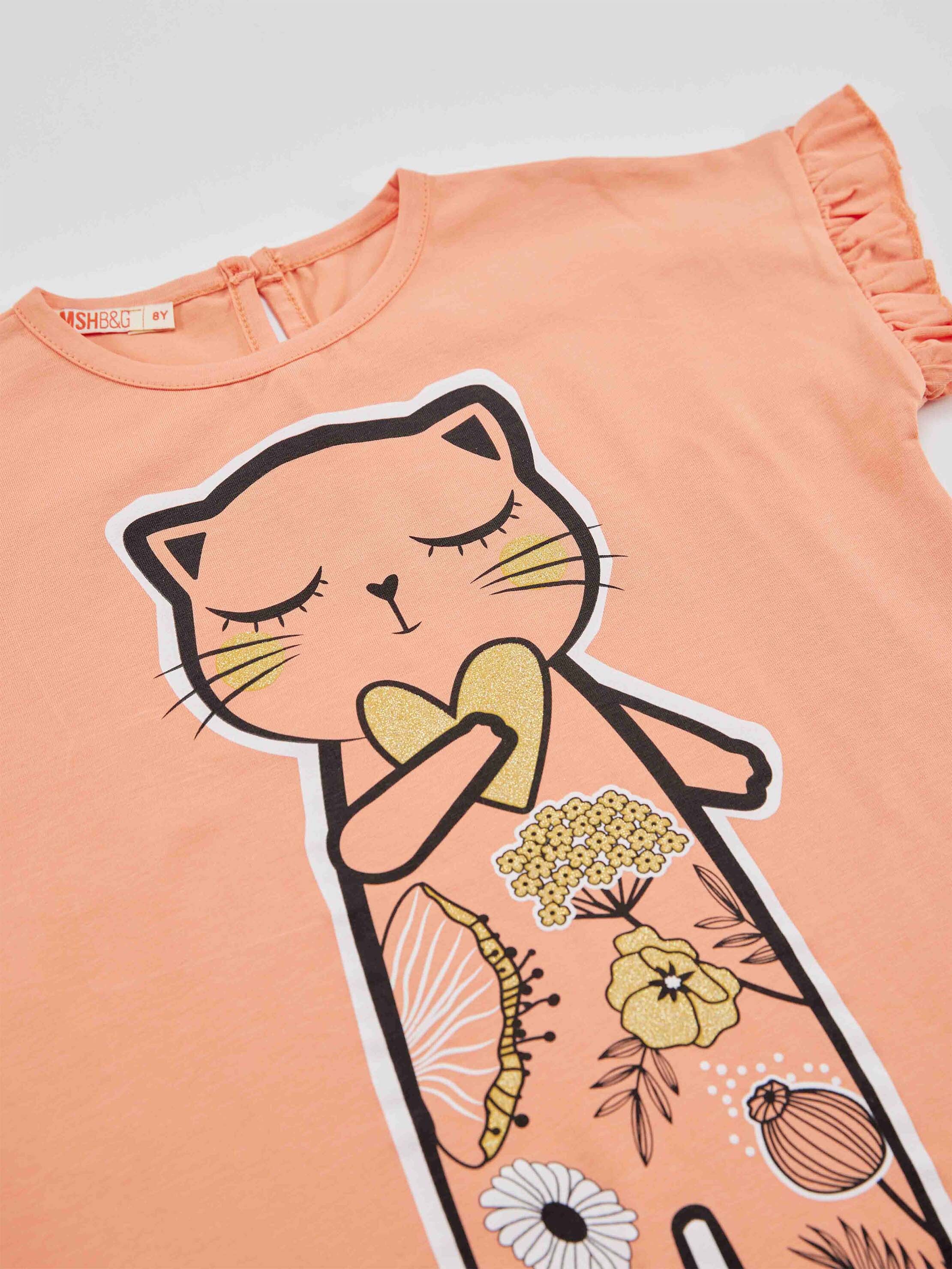 Cotton jersey girl salmon dress with a shinny cat print on. All Denokids Products are manufactured within the Kids Safety Guideline. Has been inspected by metal detectors.
