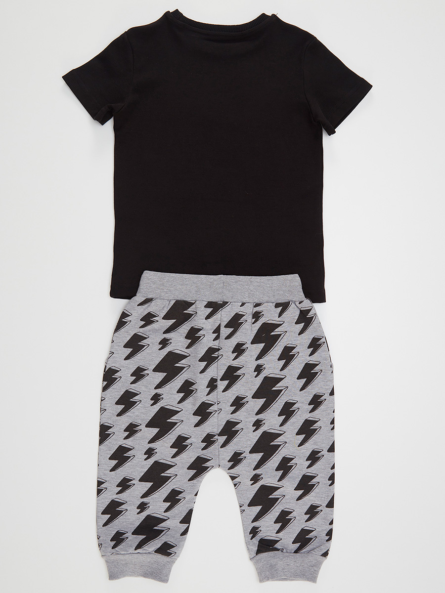 2 parça erkek çocuk t-shirt ve kapri boy pamuklu pantolon takım. Pamuklu penye kumaştan, üzeri şimşek baskılı, kısa kol t-shirt. Takımın tamamlayıcısı pamuklu penye kumaştan, düşük ağ kesimli, rahat kapri. Beli lastik ve kordonludur. Bu ürün Avrupa standartlarında "Çocuk Güvenliği Kuralları"na uygun olarak üretilmiştir. İğne dedektörlerinden geçirilmiştir. Üst %100 Pamuk Alt %65 Pamuk %35 Polyester