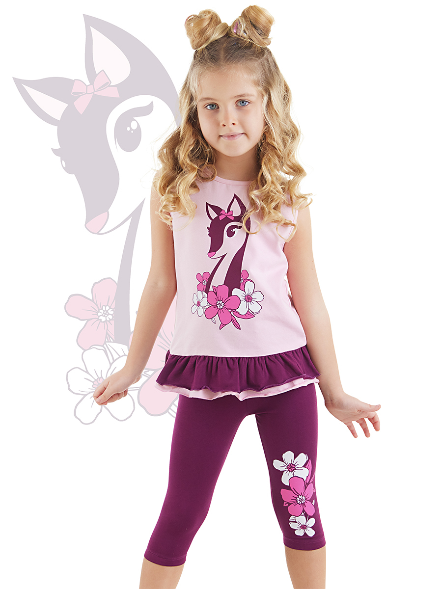 2 parça kız çocuk t-shirt ve tayt takım. Pamuklu penye kumaştan, bir bacağı çiçek baskılı elastik tayt. Takımın tamamlayıcısı pamuklu penye kumaştan, kolsuz kesim, üzeri ceylan baskılı, etek uçları 2 kat fırfır detaylı tunik boy t-shirt. Tüm Denokids ürünleri çocuk güvenlik kurallarına uygun üretilmekte ve tek tek iğne dedektörlerinden geçmektedir. %95 Pamuk %5 Elastan