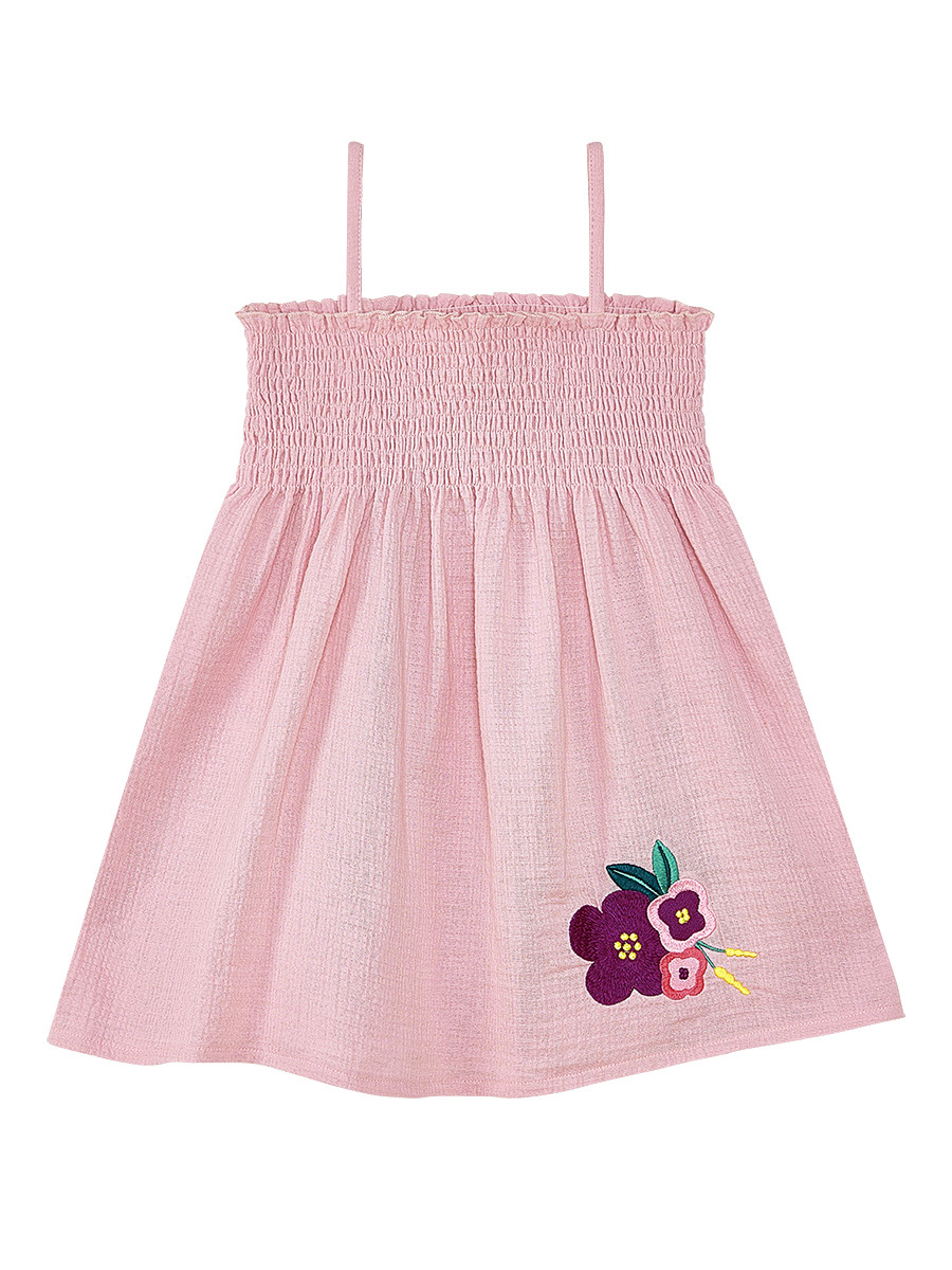 Muslin kumaştan kız çocuk elbise. Göğsü lastikle büzülmüştür. Etek ucunda nakış çiçek vardır. Tüm Denokids ürünleri çocuk güvenlik kurallarına uygun üretilmekte ve tek tek iğne dedektörlerinden geçmektedir. %100 Pamuk