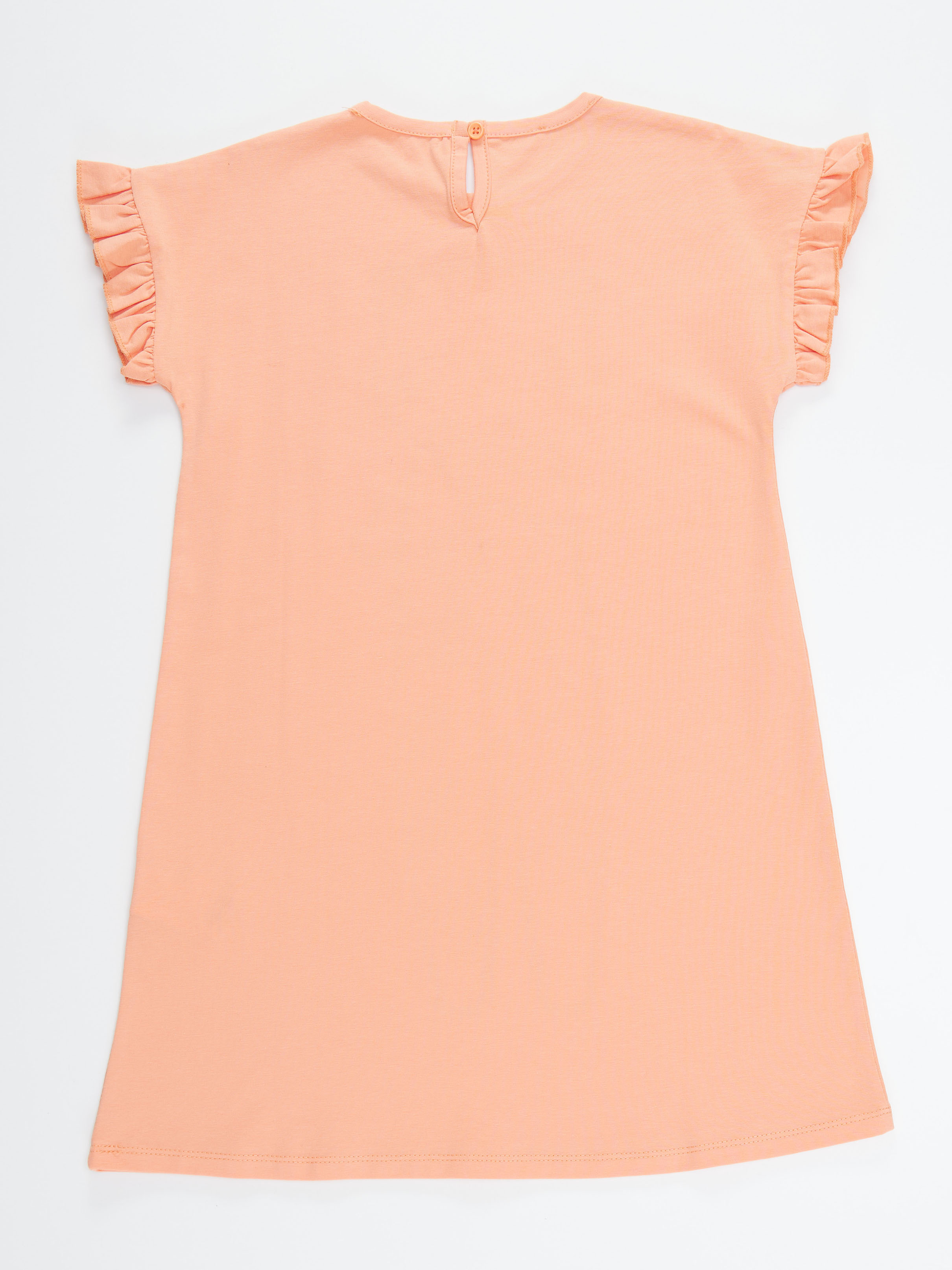 Pamuklu penye kumaştan, düşük omuz kesimli kız çocuk elbise. Elbisenin üzerinde altın simli kedi baskısı vardır. Tüm Denokids ürünleri çocuk güvenlik kurallarına uygun üretilmekte ve tek tek iğne dedektörlerinden geçmektedir.