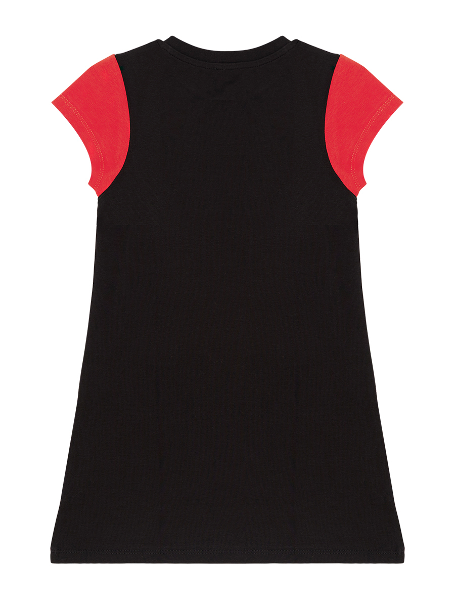 Pamuklu penye kumaş üzerine zebra baskılı, kolları farklı renk kız çocuk elbise. %95 Pamuk %5 Elastan