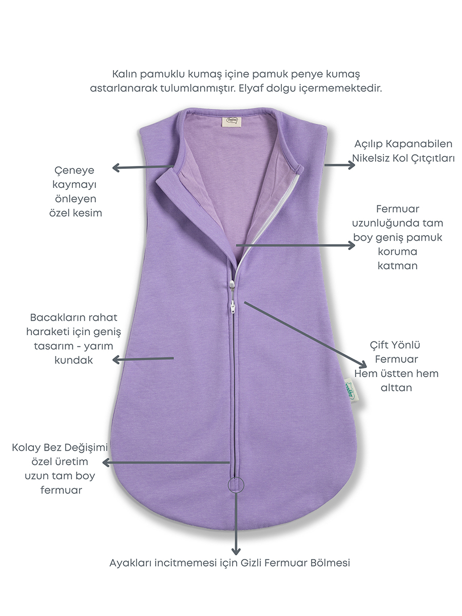 Zuppers Kundak Tulum Özellikleri:Çift katlı Zuppers Kundak Tulum 2 kat kalın pamuk katmandan oluşmaktadır.; Bebeğinize pamuk yumuşaklığı sağlar, 1,5 TOG değerindedir.; Kalın pamuklu kumaş içine pamuk penye kumaş astarlanarak tulumlanmıştır.; Elyaf dolgu içermemektedir.; Kolları çıtçıtlı olup, isterseniz açık isterseniz kapalı şekilde kullanabilirsiniz.; Çift yönlü ve tam boy fermuar ile saniyeler için bebeğinizi kundaklayabilir, uyandırmadan kolayca bez kontrolü yapabilir ve altını değiştirebilirsiniz.; Fermuar başlangıç ve bitiş noktaları ve fermuar boyunca bebeğinizin tenini incitmemesi için fermuar koruma bantları tasarlanmıştır.; Kol çıtçıtları nikel içermez.; Çıtçıt ile ten temasını önleyen pamuk yarım ay manşetler bulunur.; Zuppers kundakların etiketi bile pamuktan üretilmiştir.; Gizli dikişler ve biye korumalar kullanılarak bebeğinizin cildine sert kumaşların temas etmemesi sağlanır.; Her iki tarafa da esneyen kumaşı ve aşağıda genişleyen tasarımı ile bebeğinizin hareketlerini kısıtlamaz.; Kanserojen boyar madde içermez, Oekotex sertifikalıdır.; Zuppers Kundak Tulum Avantajları:Bebekler düzenli ve kesintisiz uyku için anne karnındaki gibi kendini güvende hissetmek ister.; Zuppers kundaklar; bebeği sarmalar ve kendini güvende hissederek sakinleşmesini sağlar.; Kundaklanmak, özellikle ilk aylarda görülen ve bebeklerin sık uyanmasına neden olan Moro refleksine bağlı ani irkilmeleri azaltır.; İlk aylar sonrasında kundaklamadan çıkarma döneminde önce tek kol sonrasında çift kol açarak bebeğinizin sakin bir şekilde yeni düzene alışmasını sağlayabilirsiniz.; Kese şeklindeki tasarımı ile kalça çıkığını engeller ve bacakların rahat hareket etmesini sağlar.; Doğal kumaşı sayesinde TOG değerine uyumlu oda sıcaklığında bebeğin vücut sıcaklığını sabit tutar, üşümesini veya terlemesini engeller.; Battaniye olmadan bebeğinize öncelikle güvenli uyku sunar.; Amerikan Pediatri Derneği kundaklamayı önermektedir.; Zuppers Kundak Tulum TOG Tablosu:18-20° oda sıcaklığında kısa kollu çıtçıtlı body ile uzun kollu alt-üst pijama üzerine; 20-22° oda sıcaklığında sadece uzun kollu alt üst pijama veya uzun kollu çıtçıtlı body ve bir pijama altı ile; 22-24° oda sıcaklığında ise sadece kısa kollu çıtçıtlı body ile giydirebilirsiniz.; TOG değeri, kumaşın ısı geçirgenliğini ifade eder.; Zuppers Uyku Tulumunuzu 18-24° oda sıcaklığında tabloda belirtilen kıyafetler ile kullanabilirsiniz.; *Bu tablo rehber olarak hazırlanmıştır.; Lütfen bebeğinizin hastalık, alışkanlık, klima, üşüme & ısınma gibi genel durumunu kontrol ediniz.; Zuppers Kundak Tulum Nasıl Seçilmeli?Yenidoğandan 12 aya kadar 3 farklı bedeni bulunur.; Uyku tulumu bebeğinizin üzerine oturması ve sarması gerektiğinden kendi bedenine uygun ürünü almanızı öneririz.; Yakasının ve bebeğinizin boynu arasında 1 anne parmağı kadar boşluk olması yeterlidir.0-3 ay omuzdan ayağa ürün uzunluğu: 58 cm - Göğüs: 25 cm 3-6 ay omuzdan ayağa ürün uzunluğu: 67 cm - Göğüs: 27 cm 6-12 ay omuzdan ayağa ürün uzunluğu: 72 cm - Göğüs: 28,5 cm Zuppers Kundak Tulum İçerik % Bakım Önerileri:İçerik: %95 Pamuk %5 Elasten Benzer renkler ile maksimum 30° sıcaklıkta yıkamanızı öneririz.; Asarak veya sererek kurutabilirsiniz.; •Ağartıcı kullanmayınız.; •Kuru temizleme yapmayınız.; •Pamuklu ürünlerde çekme, küçülme ve tüylenme olmaması için tamburlu kurutma önerilmemektedir.; •Ütülemeyeniz.; Türkiye'de tasarlandı ve üretildi.