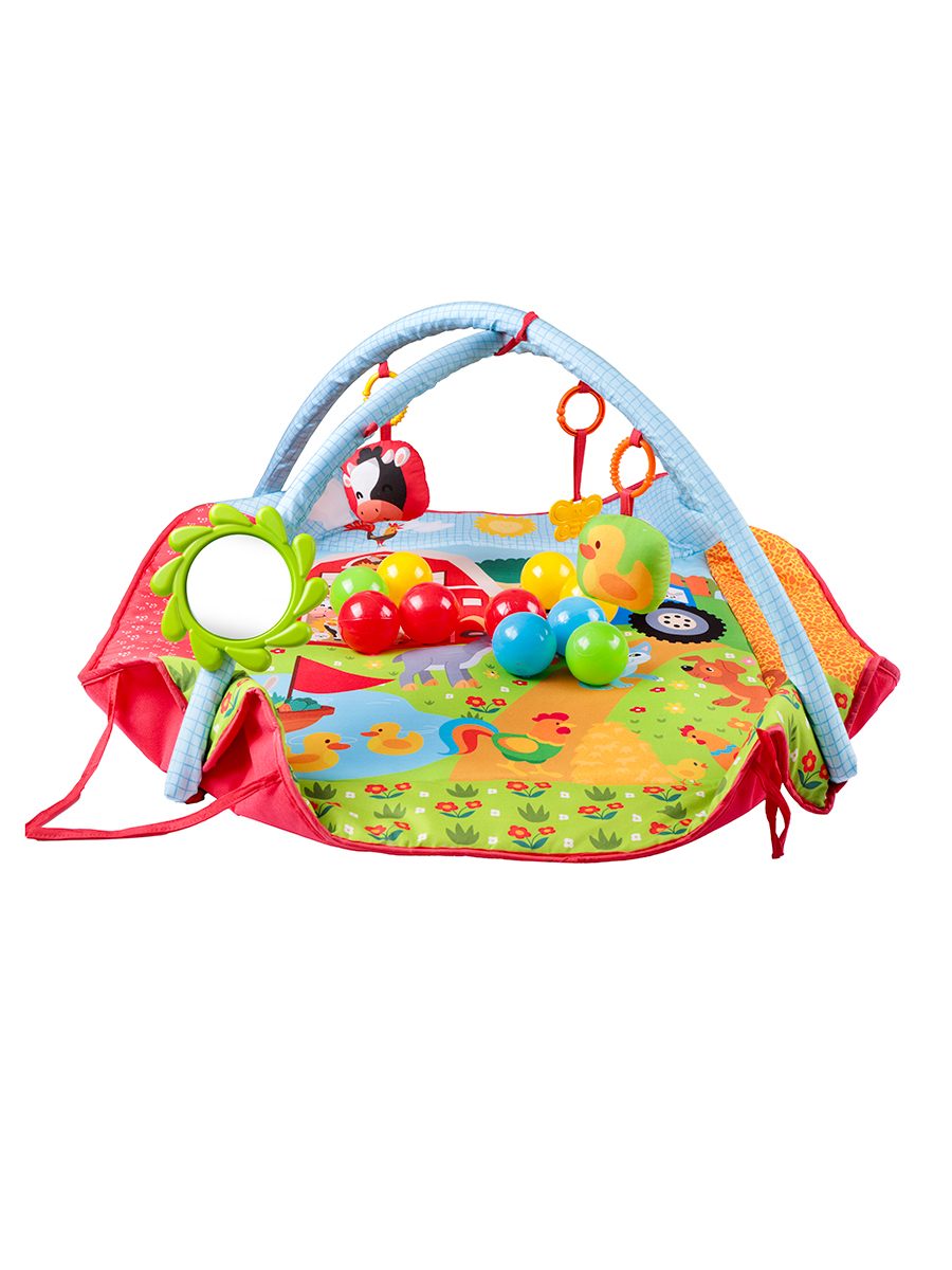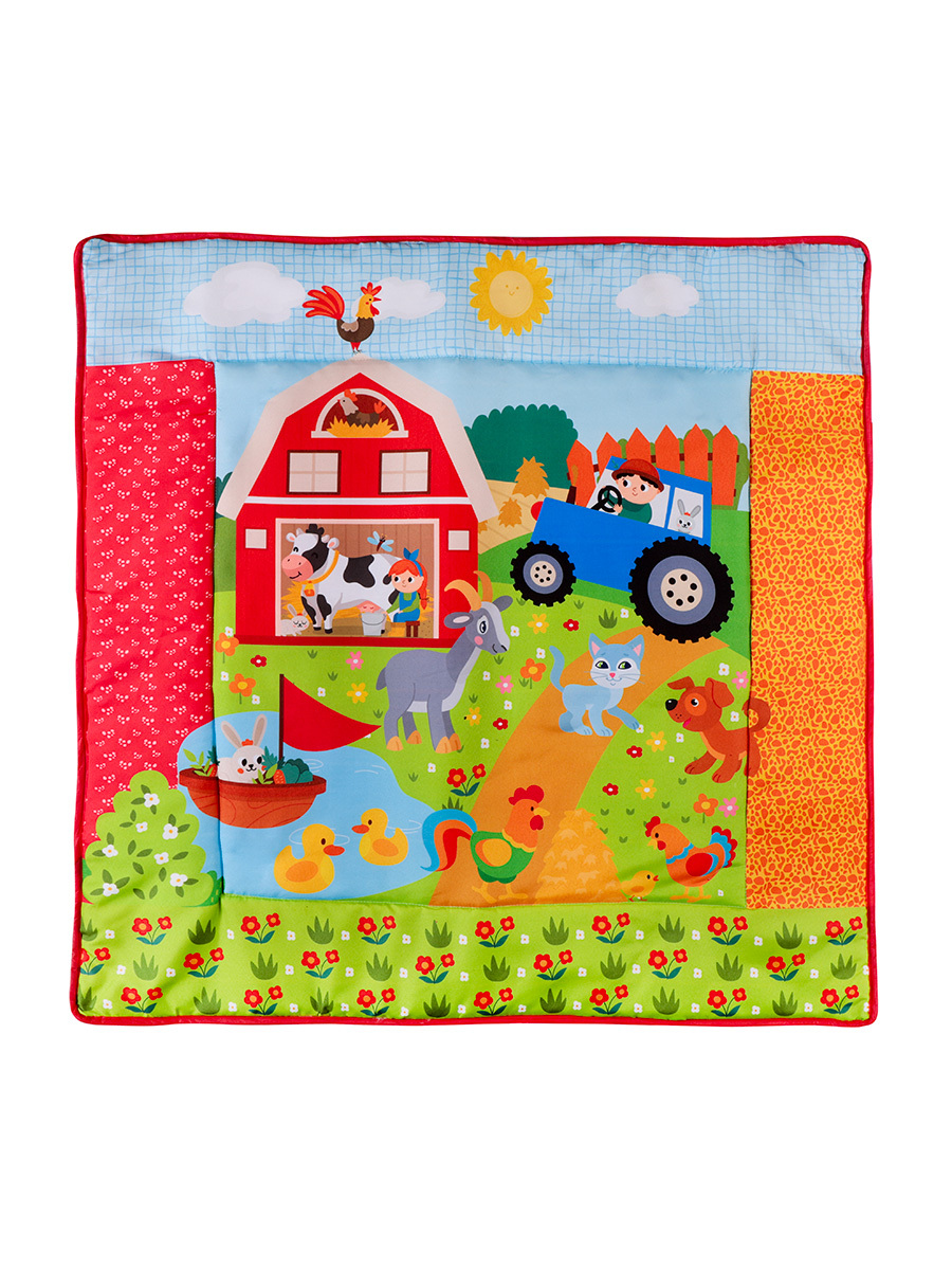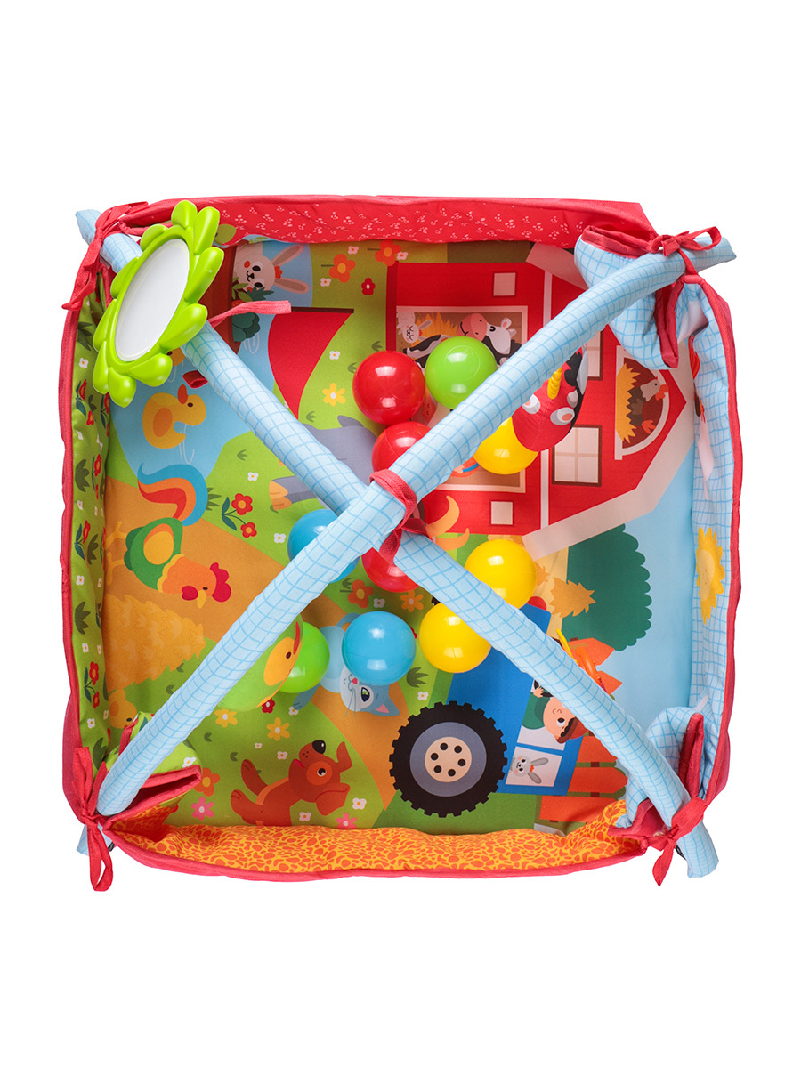 Bebeklerin eğlenirken gelişimini desteklemek üzere tasarlanmış çok işlevli bir oyun alanıdır. 85x85 cm ölçüsündeki bu geniş halı, kolayca top havuzuna dönüşebilir. Çiftlik temalıdır. 2 adet askılı oyuncak, 1 adet askılı dişlik, 1 adet bak-keşfet aynası ve 10 adet renkli topla birlikte gelir. Yumuşak yapısı, canlı renkleri ve etkileşimli aksesuarları sayesinde bebeklerin motor becerilerini, el-göz koordinasyonunu ve duyusal gelişimini destekler. Hem evde hem seyahatlerde pratik kullanım sağlar, bebekler için güvenli ve keyifli bir oyun deneyimi sunar.