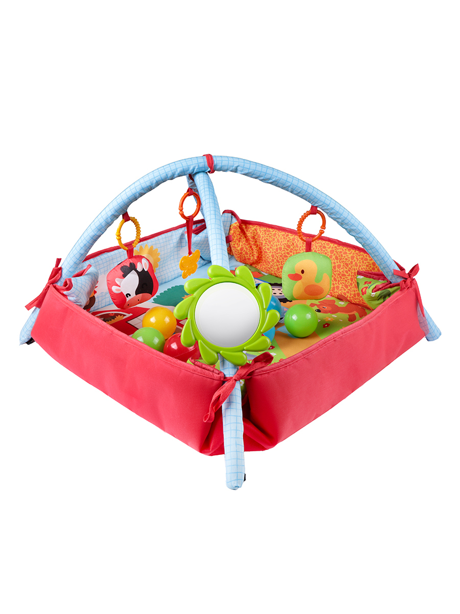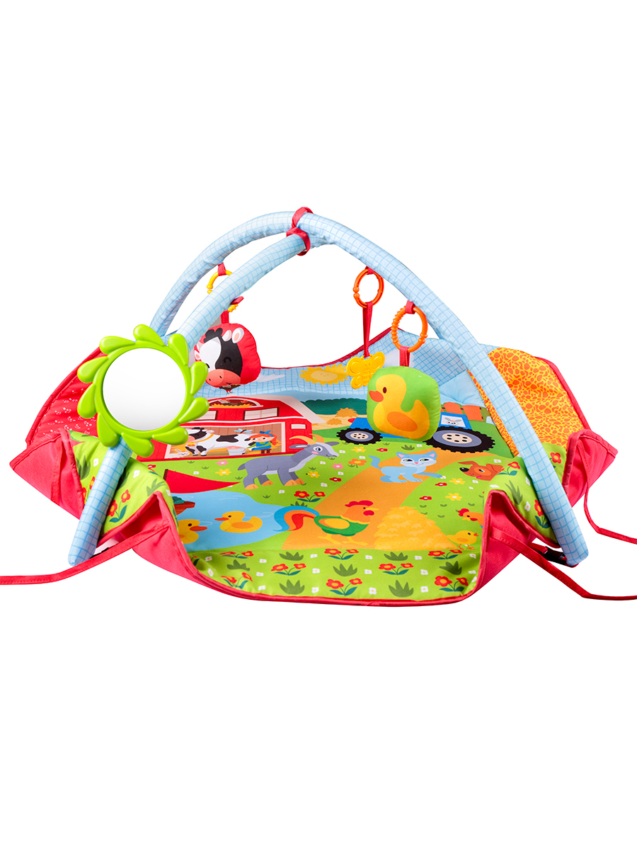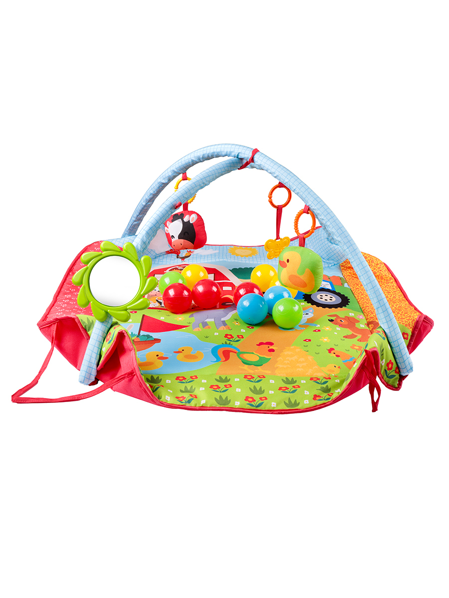 Bebeklerin eğlenirken gelişimini desteklemek üzere tasarlanmış çok işlevli bir oyun alanıdır. 85x85 cm ölçüsündeki bu geniş halı, kolayca top havuzuna dönüşebilir. Çiftlik temalıdır. 2 adet askılı oyuncak, 1 adet askılı dişlik, 1 adet bak-keşfet aynası ve 10 adet renkli topla birlikte gelir. Yumuşak yapısı, canlı renkleri ve etkileşimli aksesuarları sayesinde bebeklerin motor becerilerini, el-göz koordinasyonunu ve duyusal gelişimini destekler. Hem evde hem seyahatlerde pratik kullanım sağlar, bebekler için güvenli ve keyifli bir oyun deneyimi sunar.
