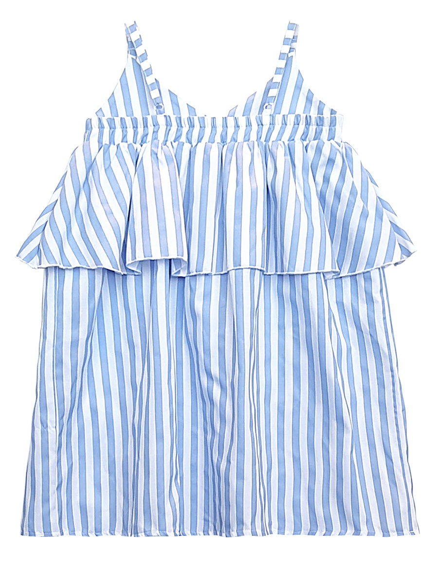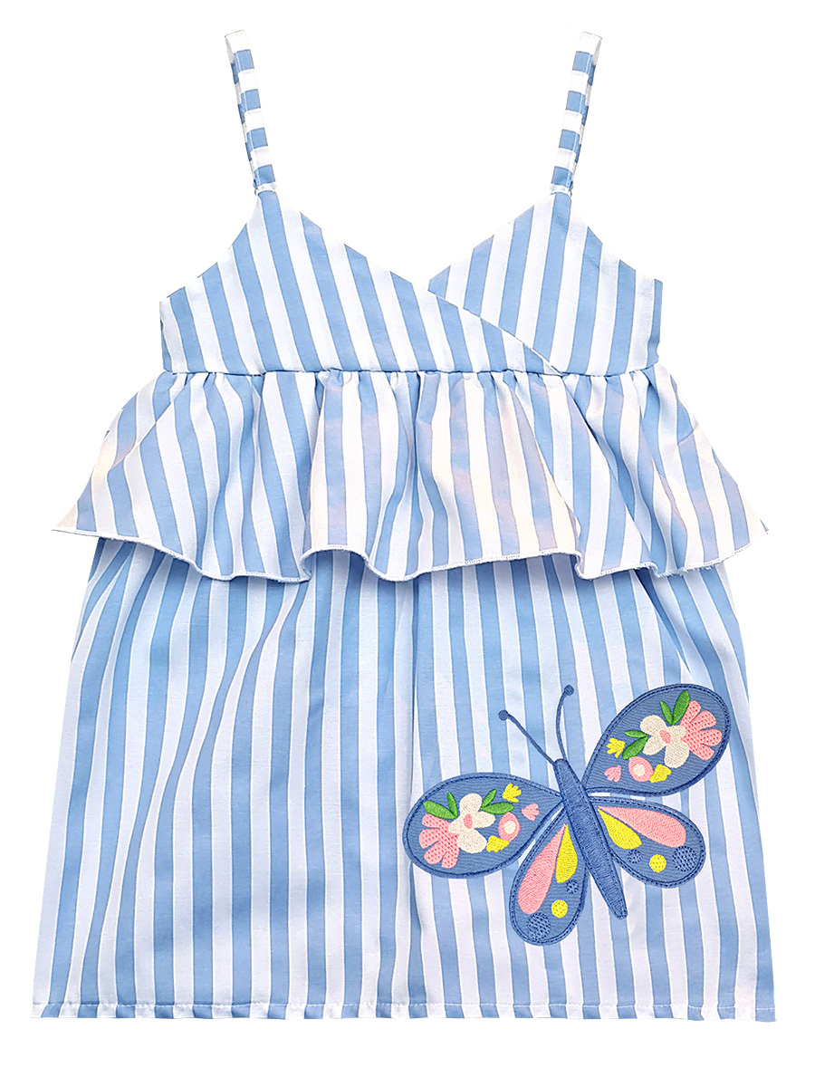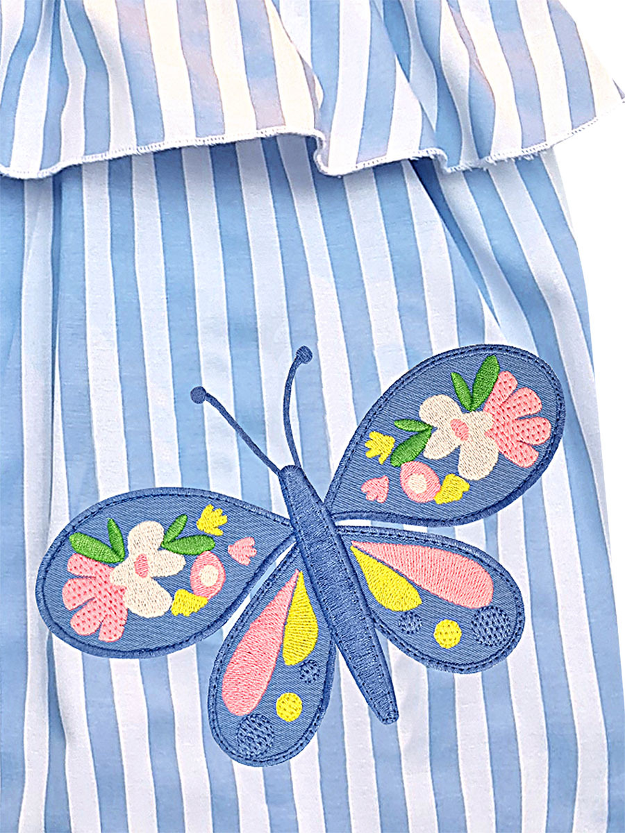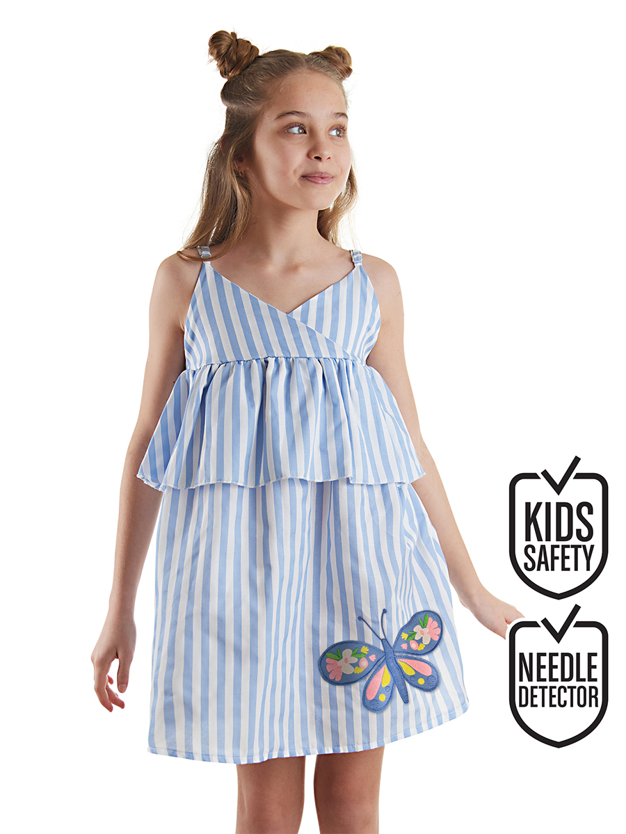 Mavi-beyaz çizgili dokuma kumaştan kız çocuk elbise. Göğüs altında fırfır vardır. Omuz askıları ayarlanabilir. Üzerinde kelebek aplikesi vardır. Tüm MSHB&G ürünleri Çocuk Güvenlik Kuralları'na uygun olarak üretilmektedir. Çocuğunuzun tenine bir zarar gelmemesi için tüm ürünler, iğne kırıklarını tespit edebilen metal dedektörlerinden geçirilmektedir. %65 Pamuk %35 Polyester