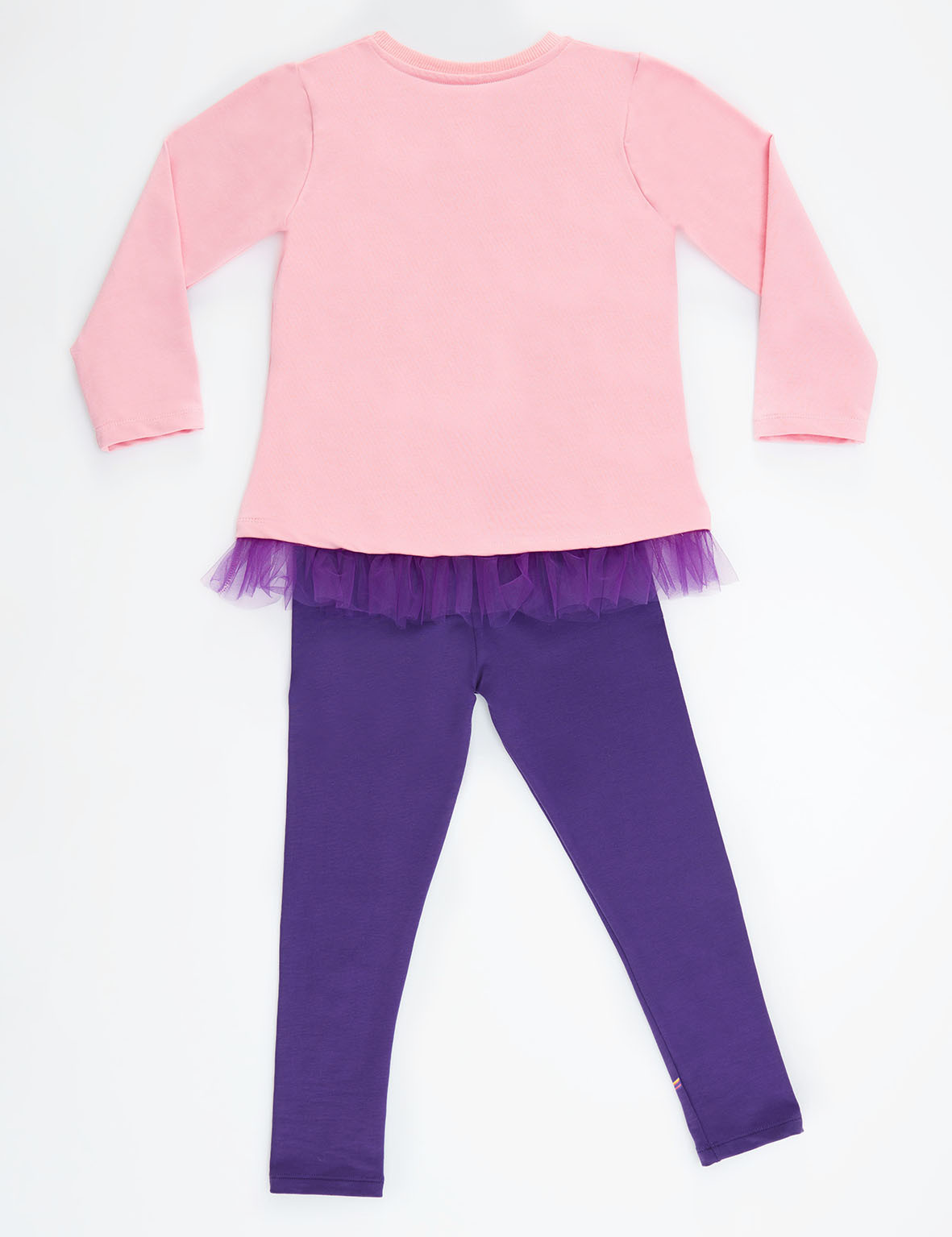 2 parça kız çocuk takım. Etek uçları tül fırfırlı, üzeri baskılı, pamuklu tunik boy t-shirt ve takımın tamamlayıcısı, her iki bacağı baskılı tayt