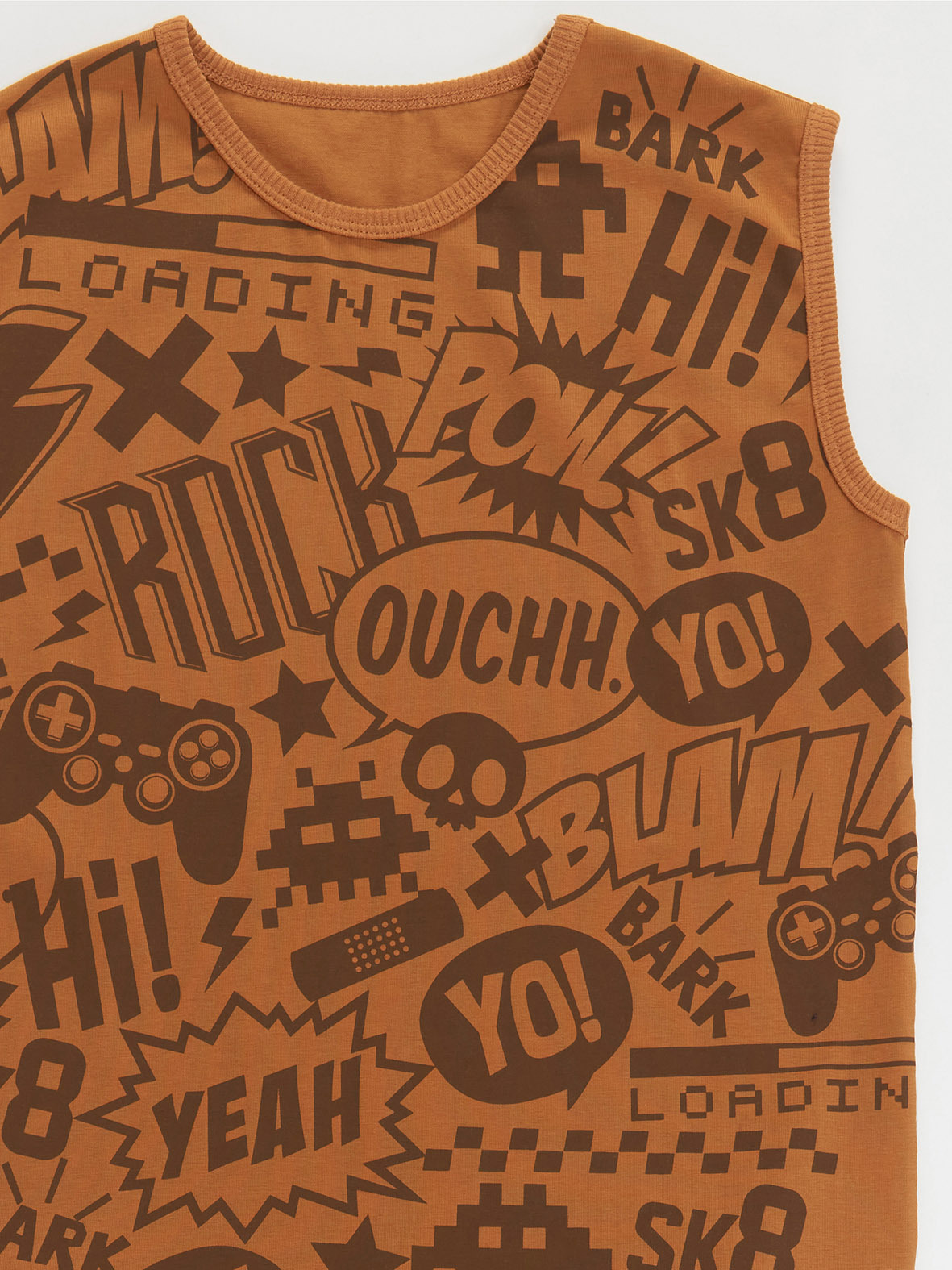 2 parça erkek çocuk takım. Pamuklu penye kumaştan, kolsuz, ön yüzü baskılı t-shirt. Takımın tamamlayıcısı orta kalın pamuklu kumaştan, yan cepli, paçaları detaylı şort. Beli lastikli ve kordonludur.