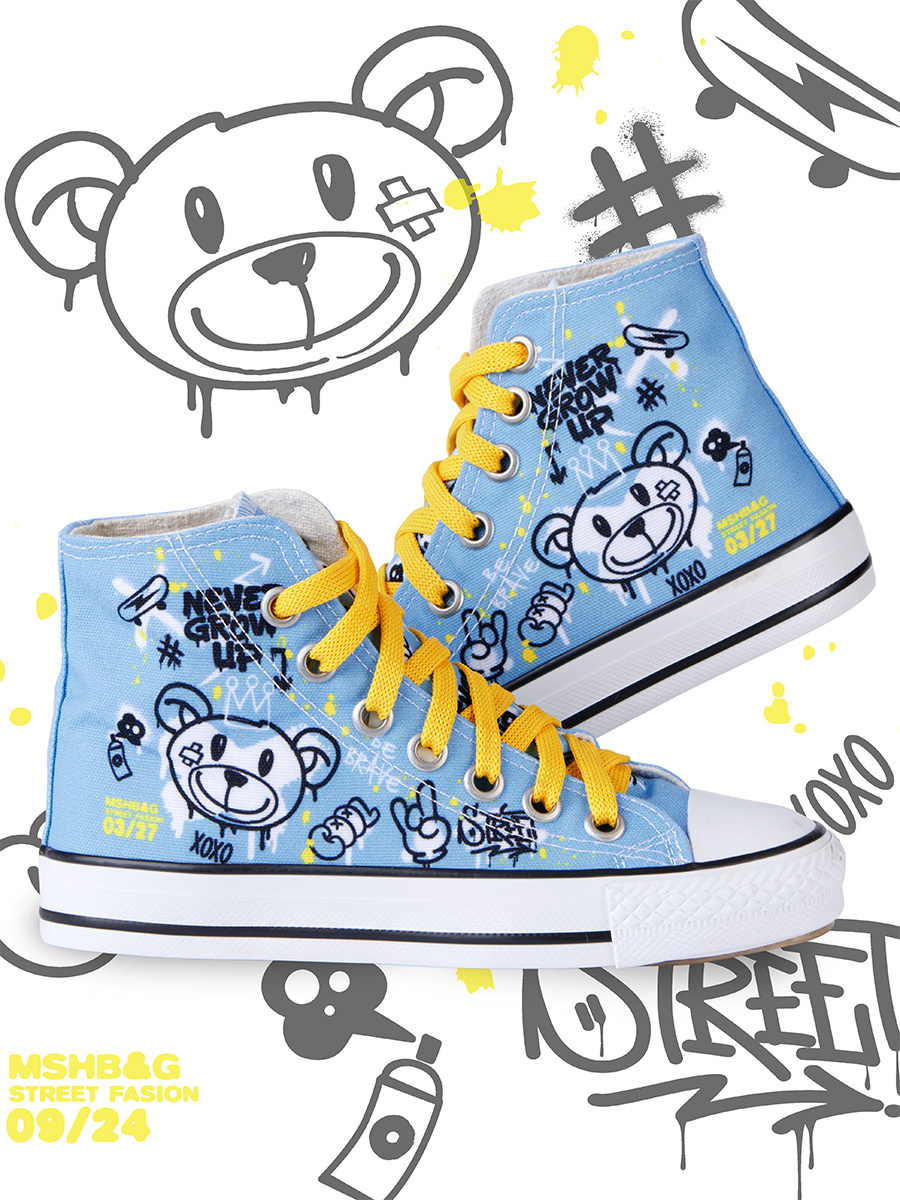 High Tops are always the icons of kids wardrobe. These blue trainers has a canvas upper and PVC outsole and finished with a street style print on. Ideal for everything from a school day to weekend adventures. Fetaures colorful laces. 0