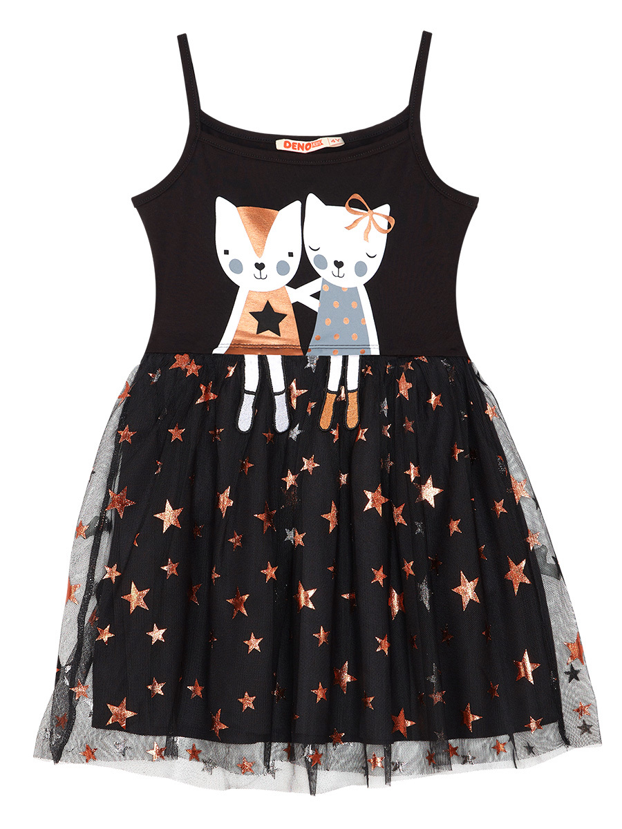 Cat printed dress with copper shine star printed skirts. The legs of the cats are 3D. Body: 95% Cotton 5% Elastane - Lining: 100% Polyester