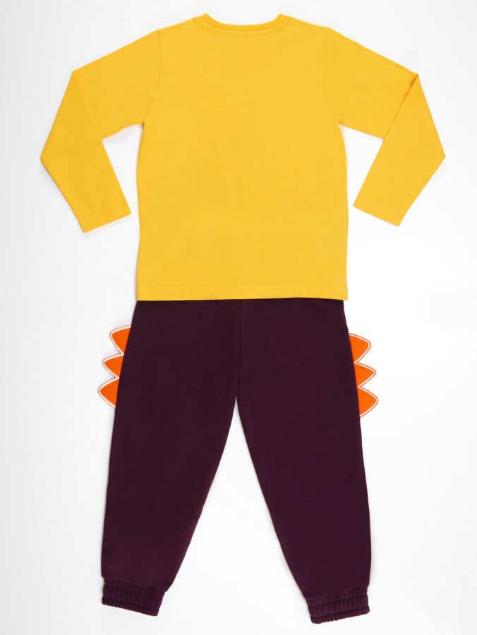 2 piece set. Tee made of cotton jersey. Has a crocodile print on. The set is completed with thick cotton pants. There is a 3D crocodile spikes on both sides of the pants. The waist of the pant has elastic bant and strings on. Top: 100% cot