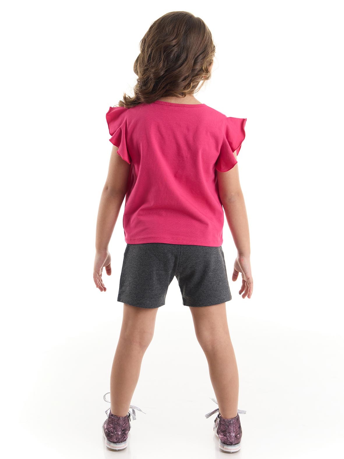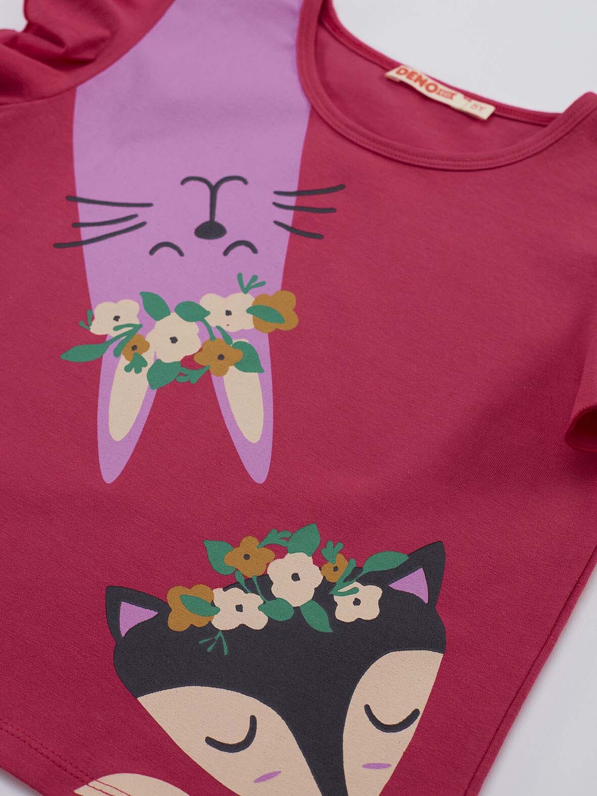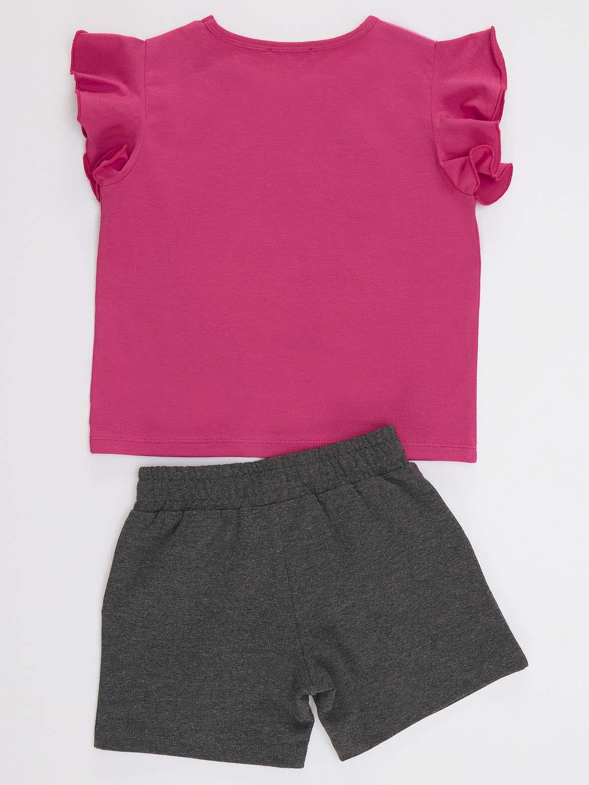 2 piece, t-shirt&shorts set. T-shirt is made of cotton jersey, has ruffles on shoulders and cute animals print on . The shorts is made of mid-thick cotton jersey. And has an elastic waist and 2 mini pockets. Top; 95% cotton 5% elastane Bot