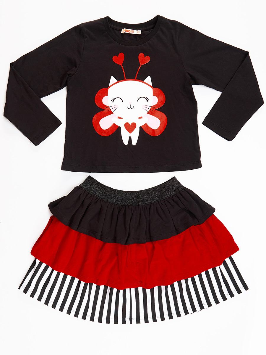 2'li takım. Pamuklu penye kumaştan üzeri kedi baskılı, uzun kollu, crop-top kesim t-shirt. Takımın tamamlayıcısı pamuklu kumaştan, 3 kat fırfırlı, beli sim lastik detaylı etek. Üst, Alt: : %100 pamuk