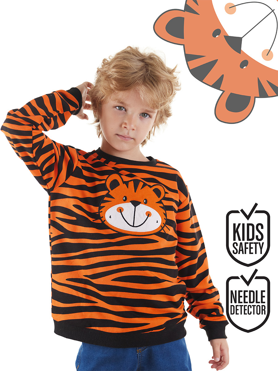 Allover tiger pattern printed boy sweatshirt. Made of French Terry Cotton. Long Sleeve, round neck. Features a tiger applique on chest. All Denokids products are produced within kids safety guidelines and dedected by needle dedectors.