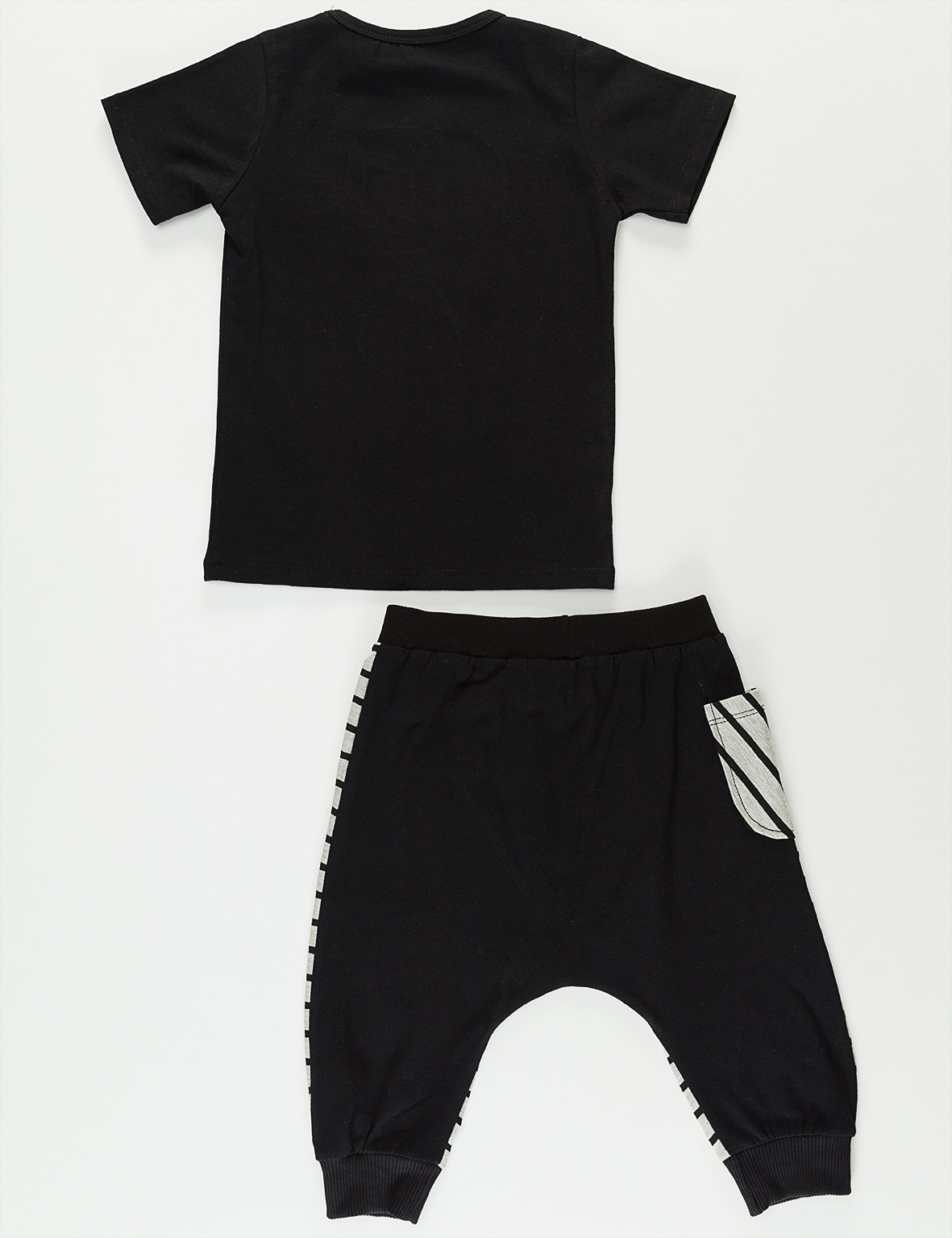2 parça takım. Baskılı ve aplikeli t-shirt ve düşük ağ kesimli, rahat, kapri boy pantolon.