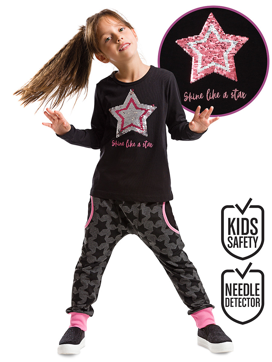 2'li takım. Çift yönlü payetlerle işlenmiş t-shirt ve özel kesim, düşük ağ modelli rahat sweat-pantolon. Kızınız payetlerin yönünü değiştirirken çok eğlenecek!