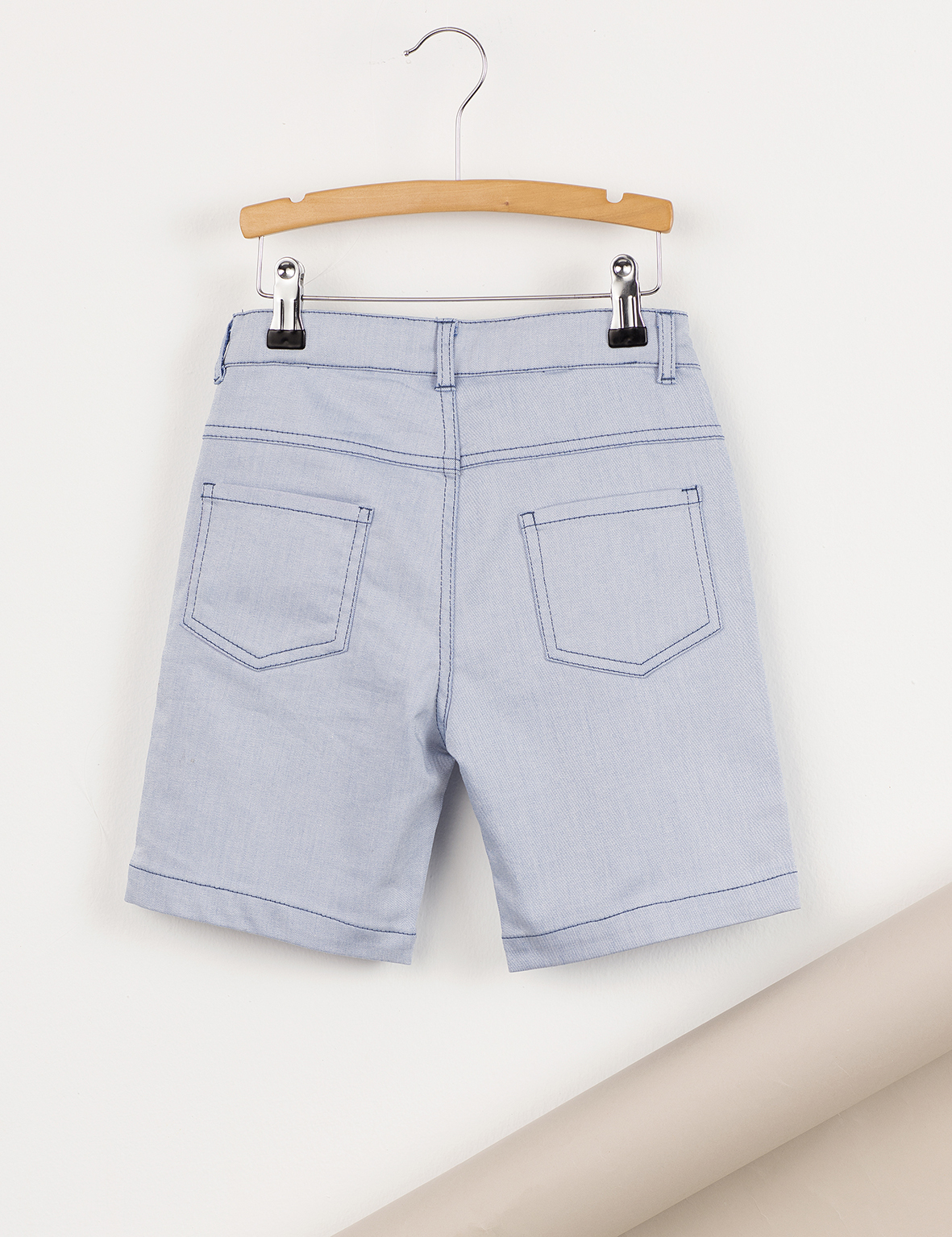 Buz mavi denim görünümlü dokunmuş kumaştan erkek çocuk şort. Fonksiyonel ön ve arka cepler. Farklı kumaştan iç astar. %60 pamuk %38 polyester %2 elastan