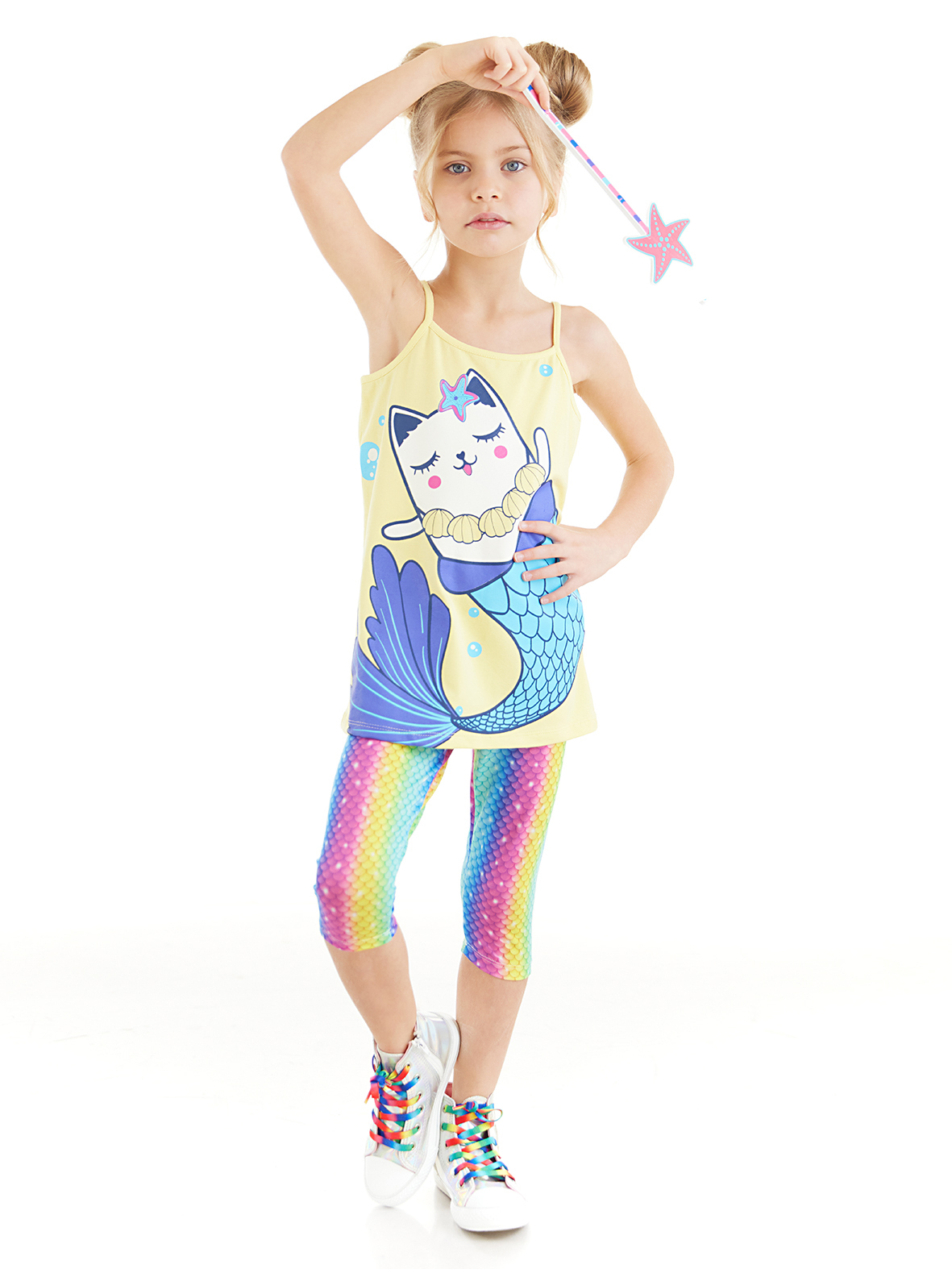 2 parça kız çocuk t-shirt ve tayt takım. Deniz kızı balık pulu desenli, elastik tayt. Pamuklu penye kumaştan üzeri baskılı, askılı t-shirt. Tüm Denokids ürünleri çocuk güvenlik kurallarına uygun üretilmekte ve tek tek iğne dedektörlerinden geçmektedir. Üst: %95 Pamuk %5 Elastan - Alt: %52 Viskon %43 Polyester %5 Elastan