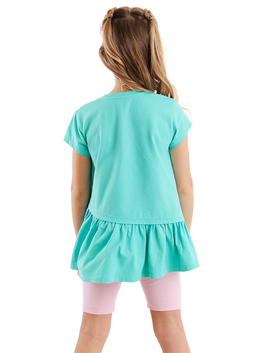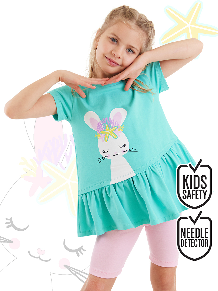 2 parça kız çocuk takım. Pamuklu penye kumaştan, turkuaz rengi t-shirt. Üzeri sevimli tavşan baskılı. Takımın tamamlayıcısı, elastik, pamuklu penye kumaştan tayt. Tüm Denokids ürünleri çocuk güvenlik kurallarına uygun üretilmektedir. Üst: %95 Pamuk %5 Elastan - Alt: %90 Pamuk %10 Elastan